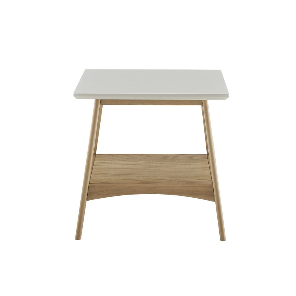Add the bold Madison Park Parker End Table to your living space. This all wooden mid-century inspired desk will go nicely with your living room decor. It features a Off-white finish table top composed from manufactured wood, a solid wood frame, and a bottom shelf for extra storage space. The two-tone gives this table a striking contrast. Assembly required.
