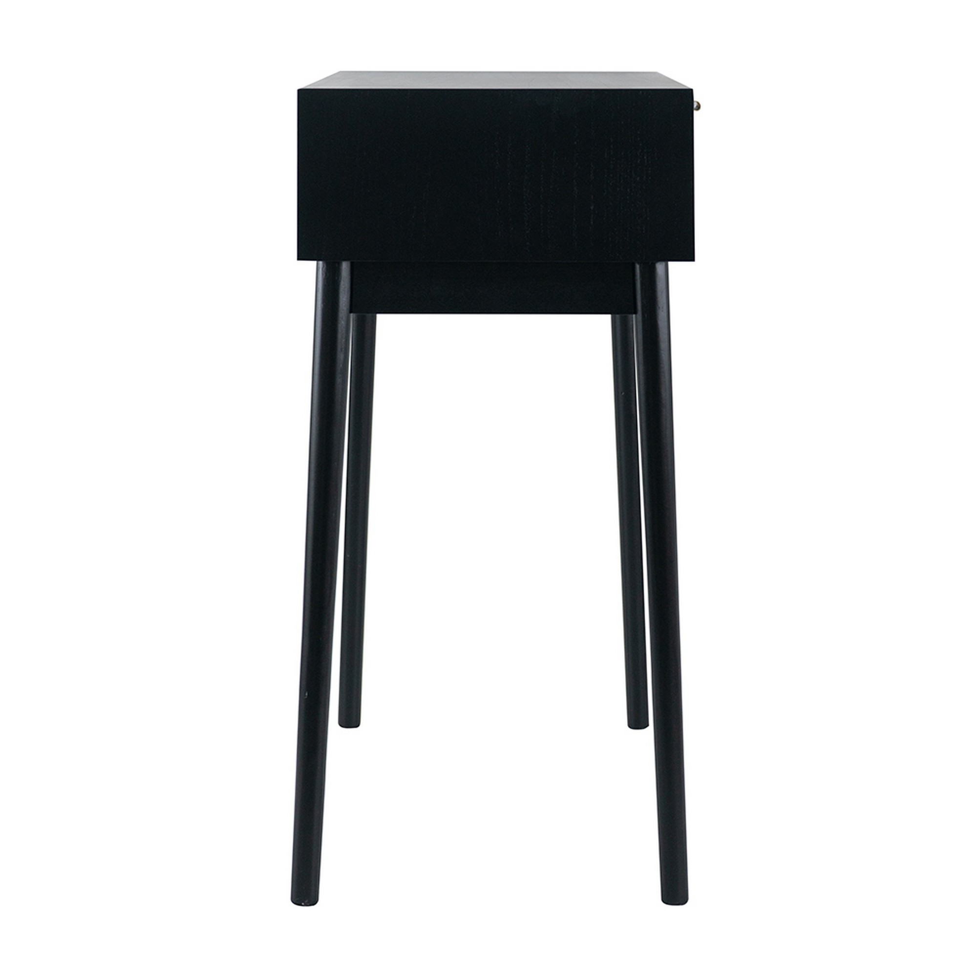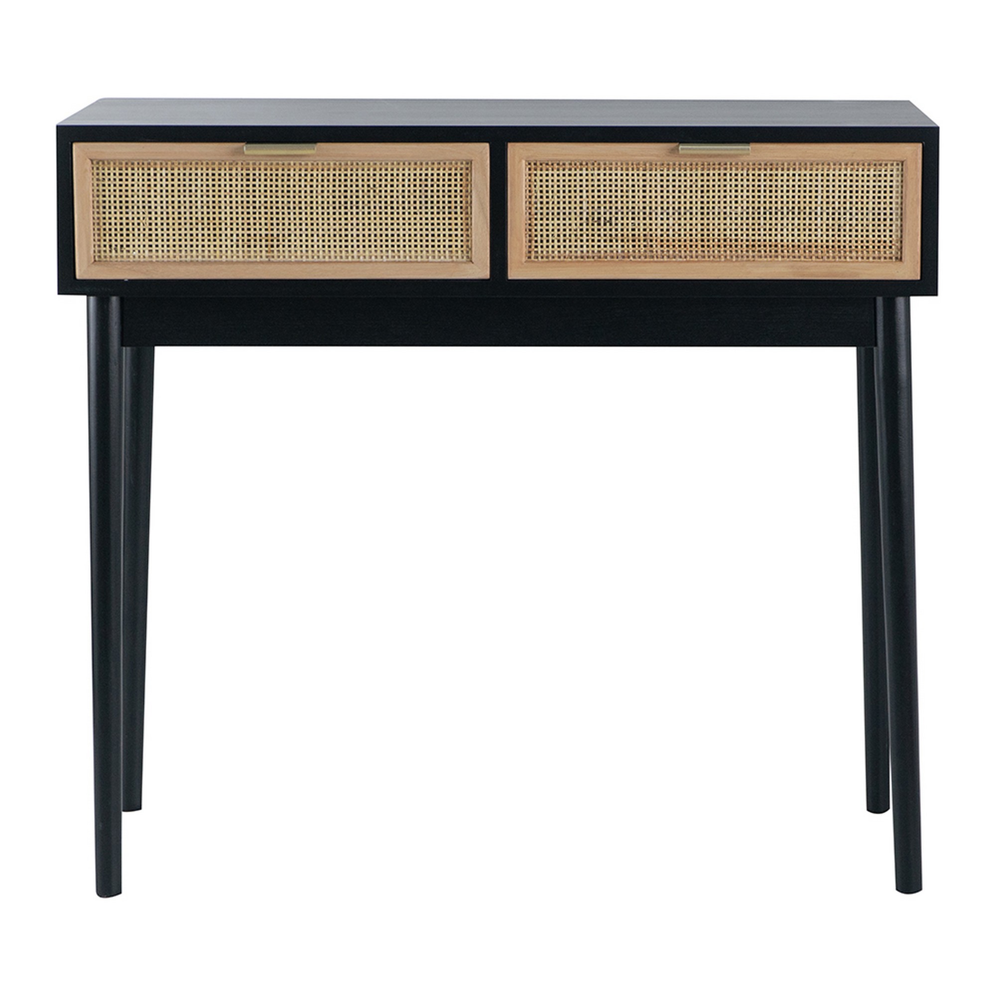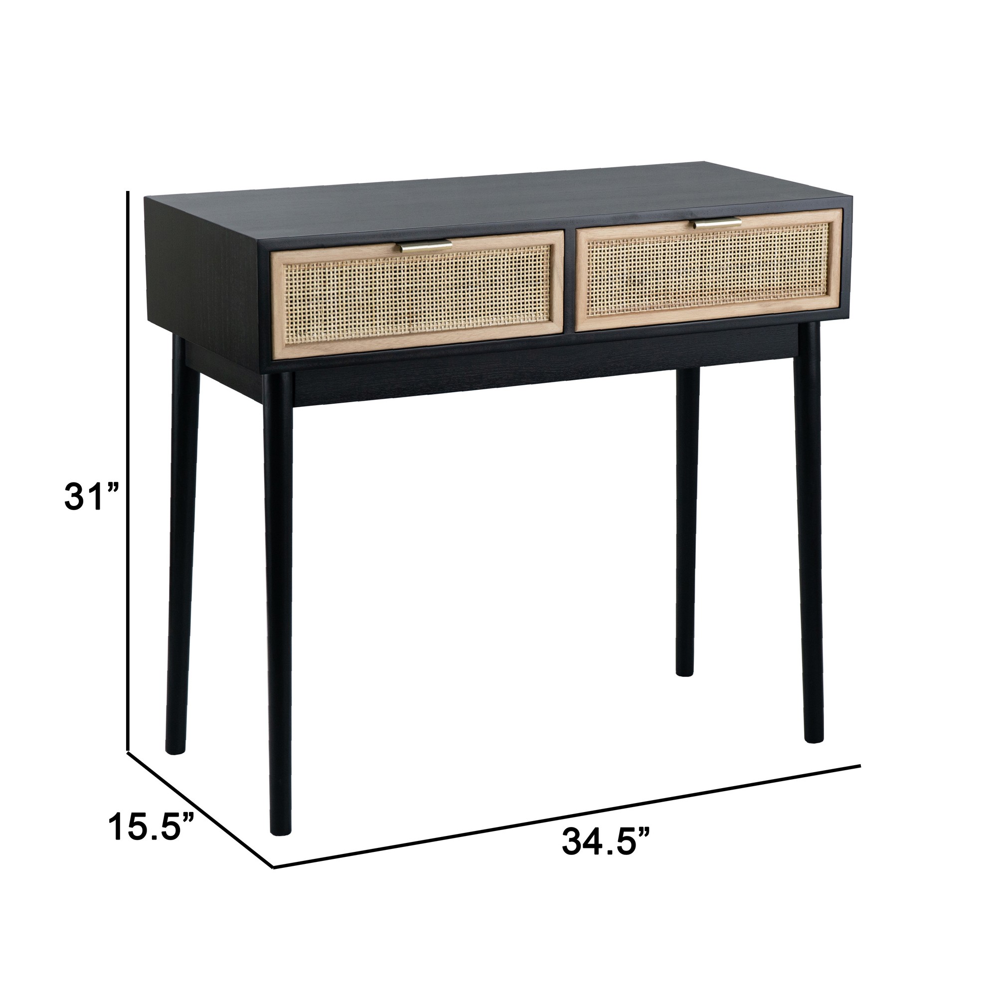 Simple clean lines meet a subtle cottage style with this elegant brown and black console table desk. With two smooth gliding drawers and woven rattan panels, it is made from sturdy pine and composite wood for lasting durability. This expertly made piece goes perfectly well with a wide variety of decor styles, be it transitional, rustic, or modern. Check out our Ela collection for more options.