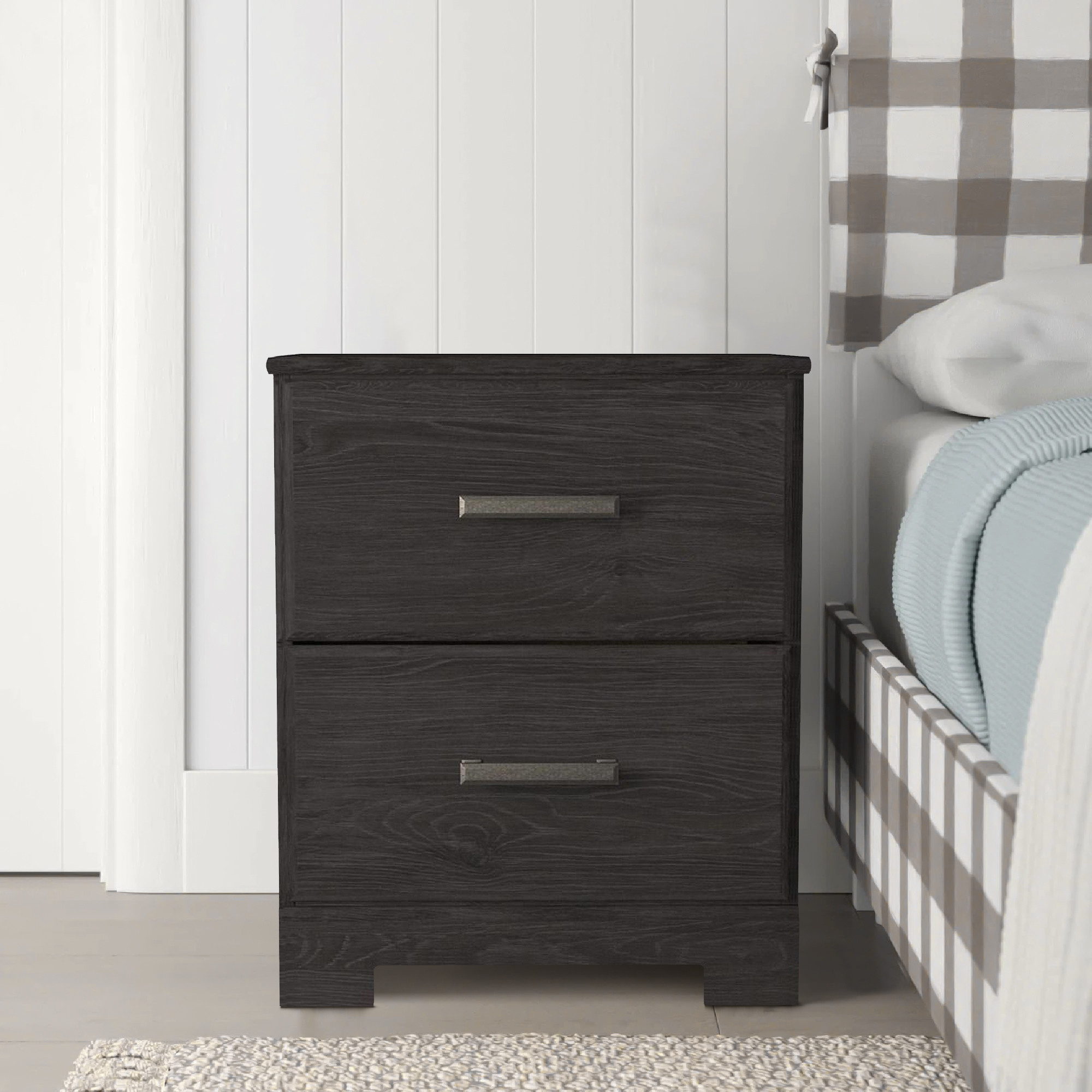 Designed to perfection, this sophisticated nightstand is exquisitely built from quality composite wood and decorative laminate. Consisting of two smooth gliding drawers and elegant pewter finished metallic bar handles, it features a dark charcoal tone with a replicated oak grain finish that adds effortless elegance to any home decor. Check out our Wren collection for more.