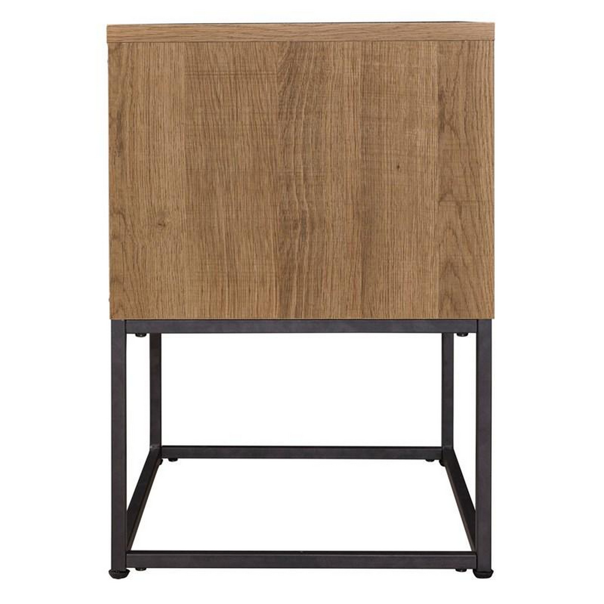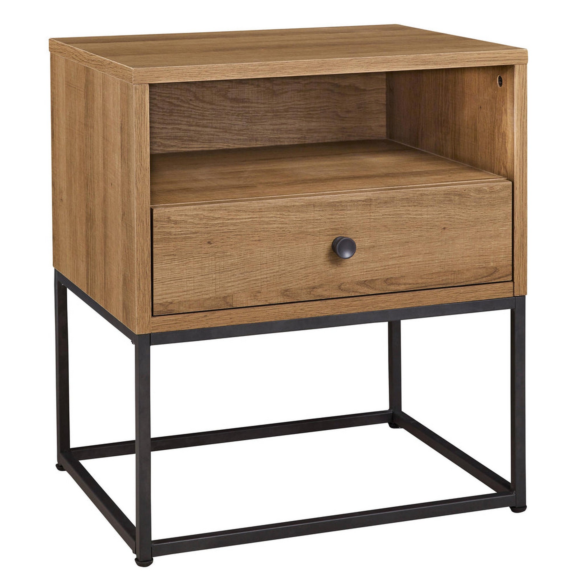 Artfully crafted with premium composite wood and laminate, this nightstand is embellished in a rich natural brown finish with even tones of replicated oak grain. One smooth gliding drawer and a shelf are designed to perfection, offering an excellent place for keeping your belongings while the metal frame base adds class and sophistication to any bedroom. Check out our Mila collection for more.