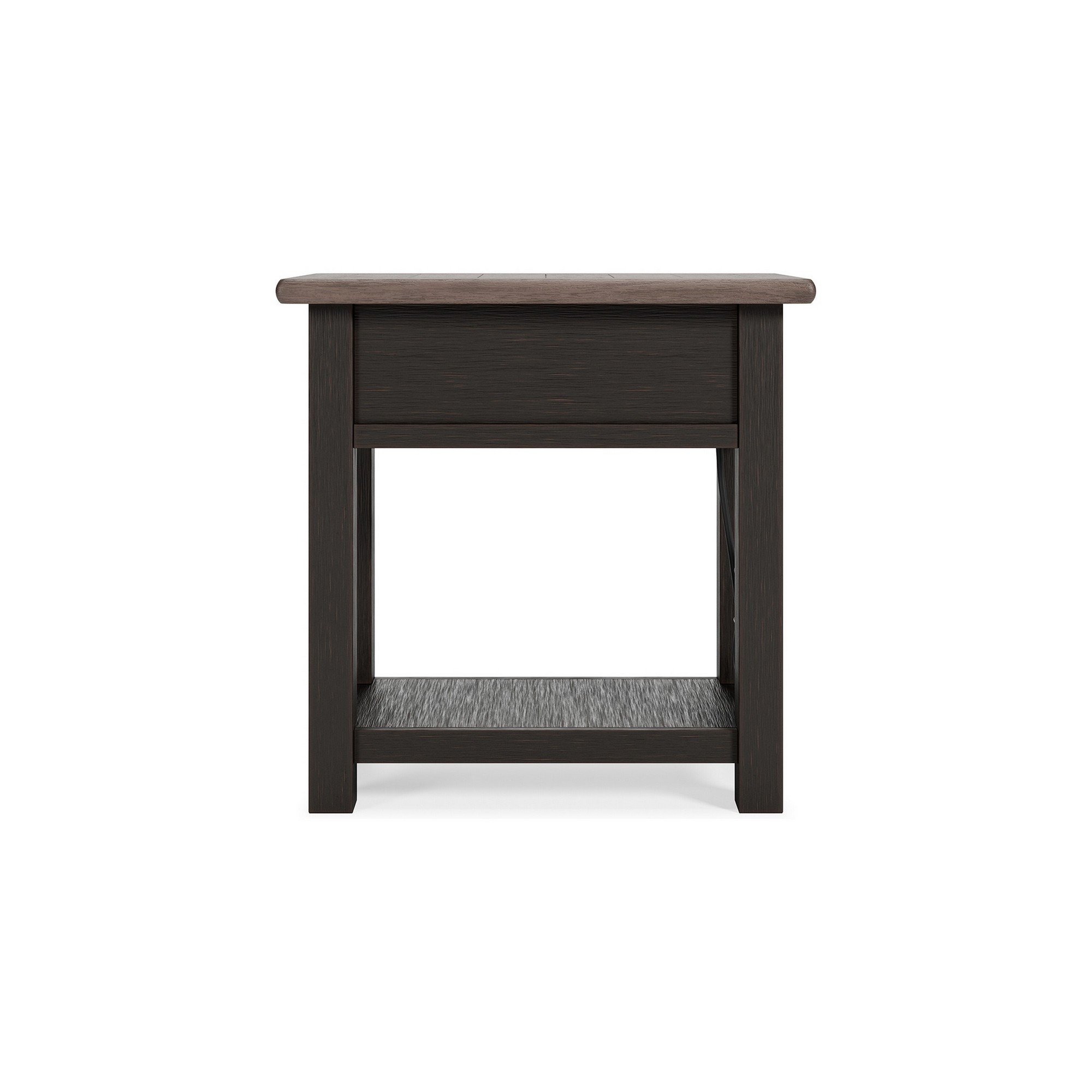 This modern and lusciously beautiful side end table acts as a striking touch of sophistication and functionality in any contemporary home. Meticulously crafted with sturdy wooden materials, this charming piece boasts a weathered grayish brown plank style tabletop and a wire brushed base above an open bottom shelf and drawer with USB chargers included for additional convenience.