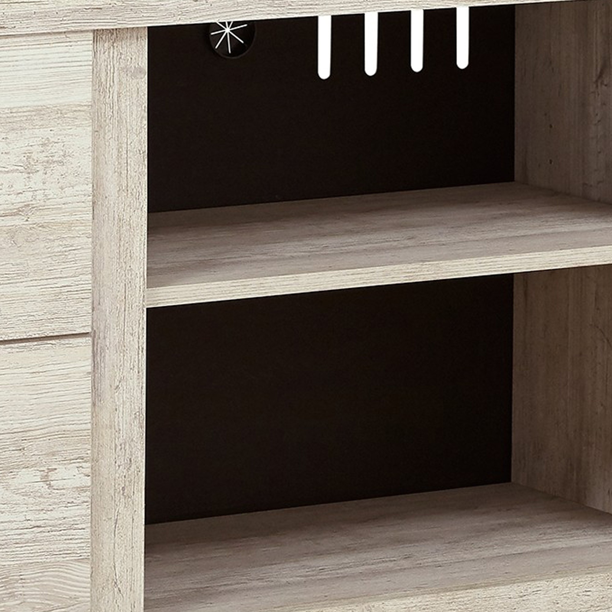 Gorgeously designed, this spacious and functional TV entertainment center console is finished with a luxurious whitewash for a striking, traditional aesthetic. Four spacious drawers and two open compartments provide convenient storage space for media devices and collections. Additionally, this piece comes equipped with convenient holes for wire management.