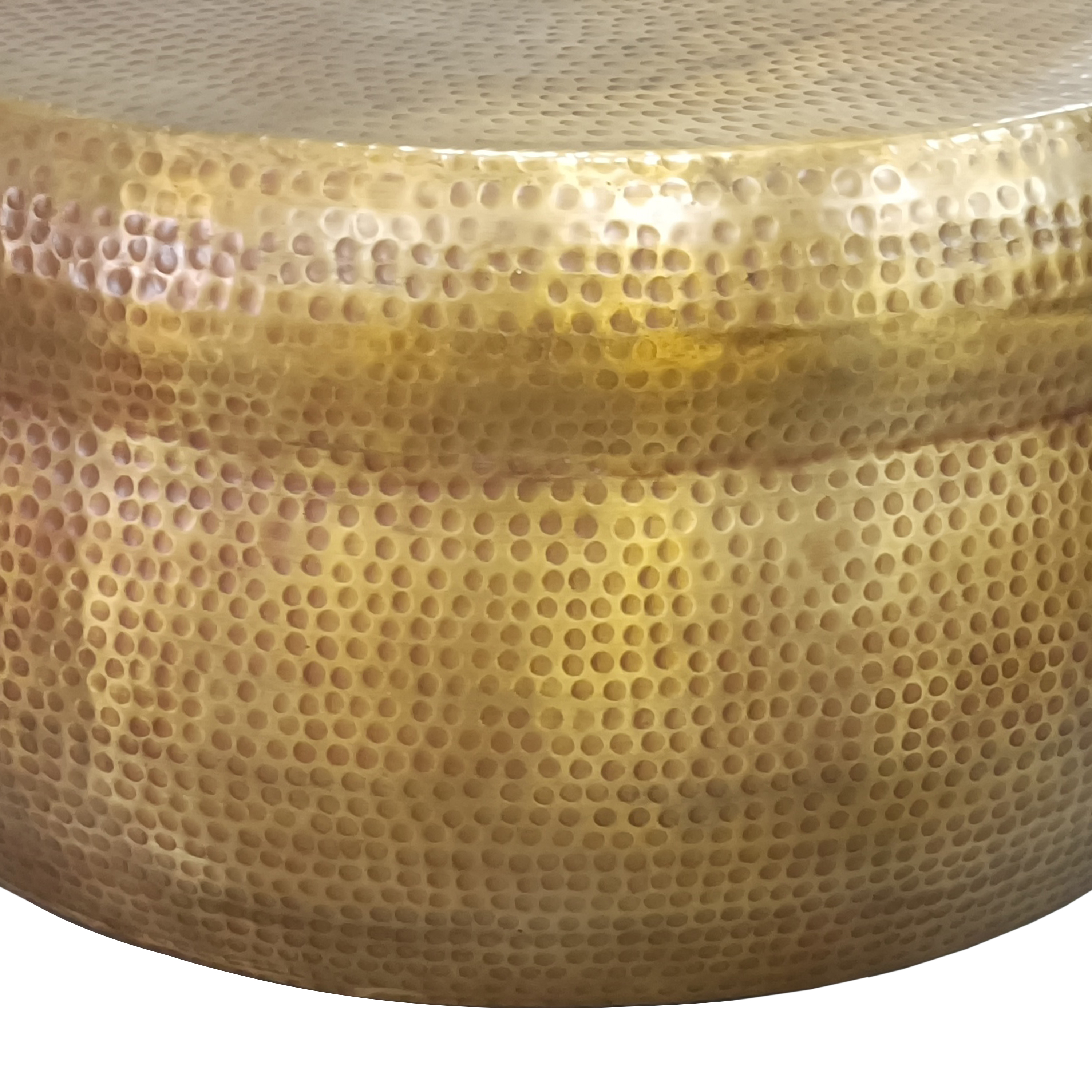 Kvira 32" Artisanal Round Drum Coffee Table, Hammered Embossed Texturing, Aluminum, Antique Brass