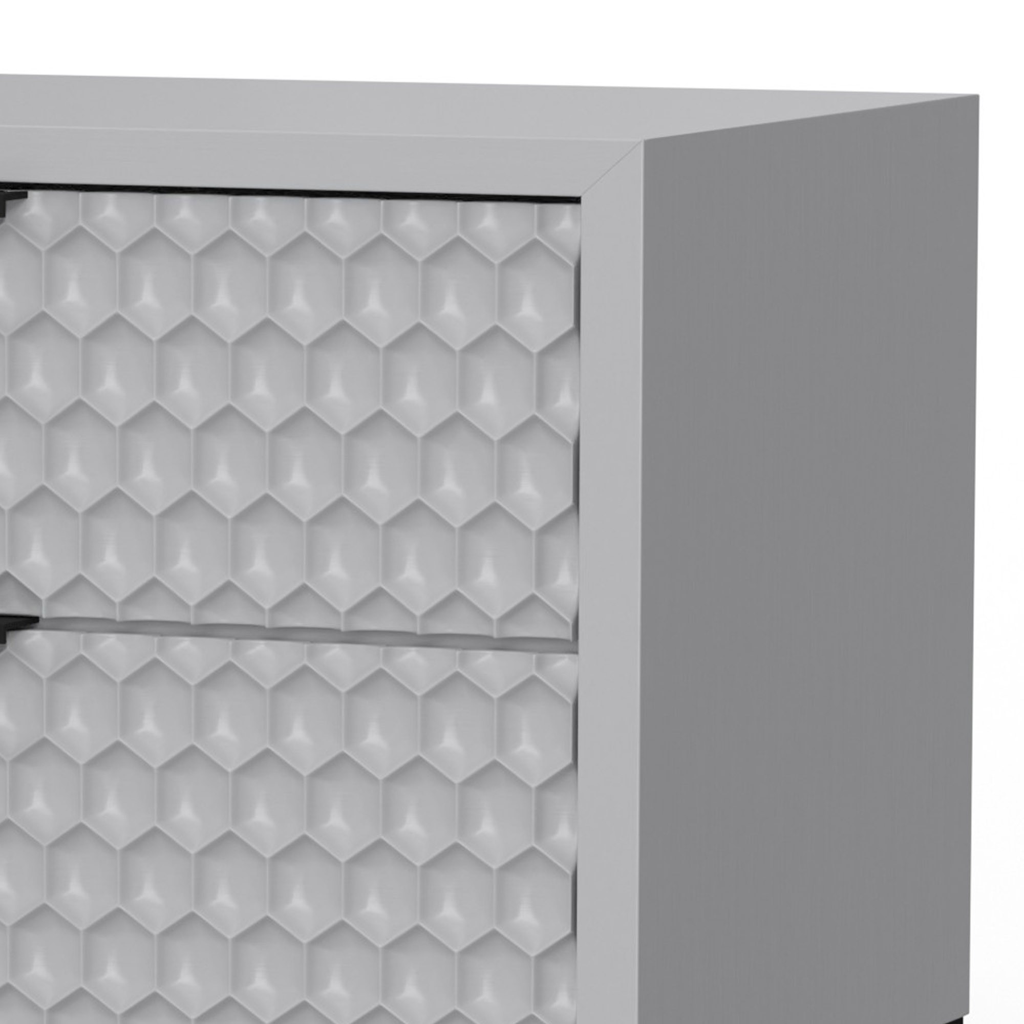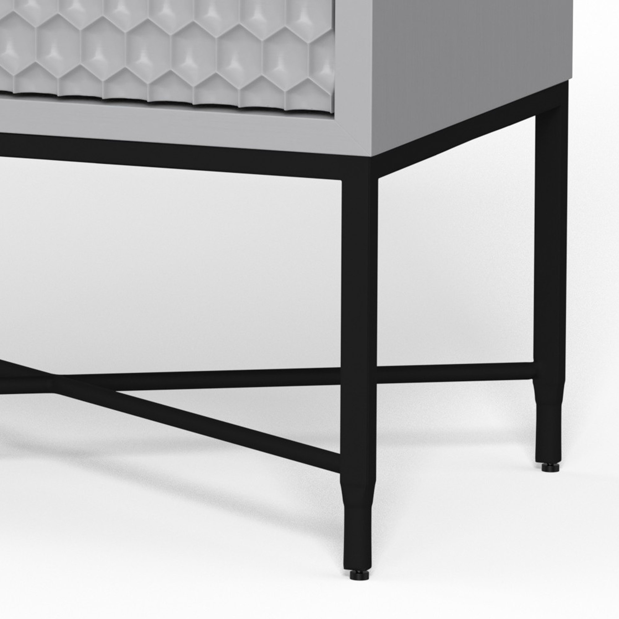 Our modern nightstand from the Rexi bedroom collection makes the perfect bedside companion. Two smooth gliding drawers offer space for trinkets, books, and more, while the honeycomb pattern drawer panels bring a gorgeously unique character to your decor. Made from mahogany wood and veneer in a light slate gray finish with a black metal frame. Check out our Rexi collection to complete the set.