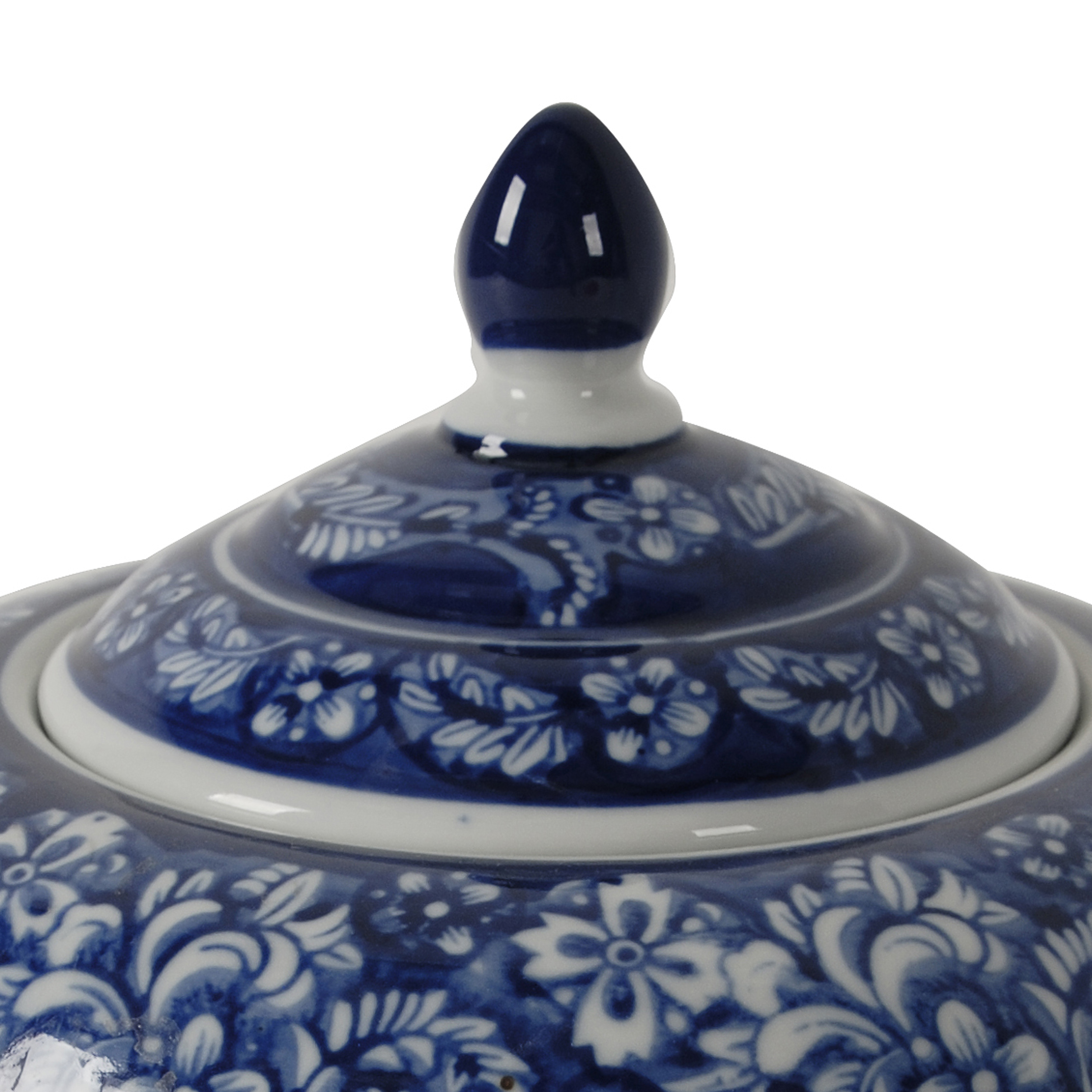 Home > 10 Inch Lidded Jar, Curved Round Persian Floral Print, Blue Porcelain