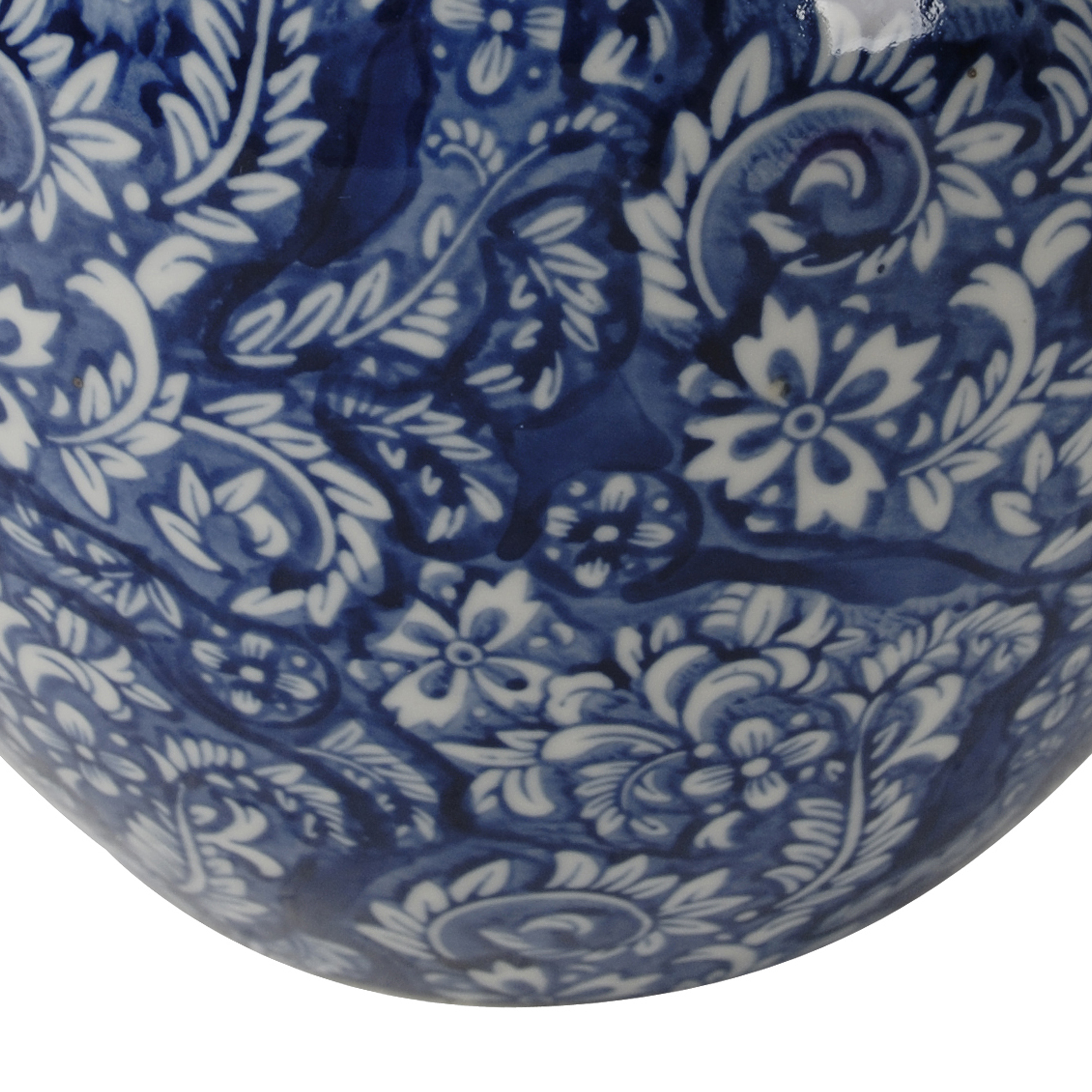 Perfect as a discreet storage space for trinkets and decorations, or as simple yet stunning entryway accent, this artistically styled lidded jar is crafted from porcelain in a vibrant blue finish. The sleek curved shape is fitted with a finial accent on the lid while the persian inspired floral print gives a voguish and eye catching twist to its otherwise traditional design.