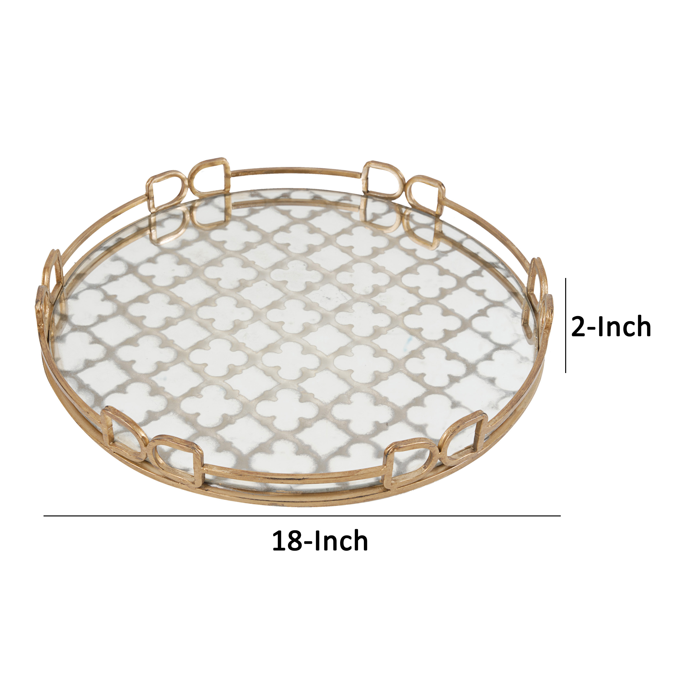 Sui 18 Inch Round Decorative Tray, Glass Bottom and Gold Geometric Frame