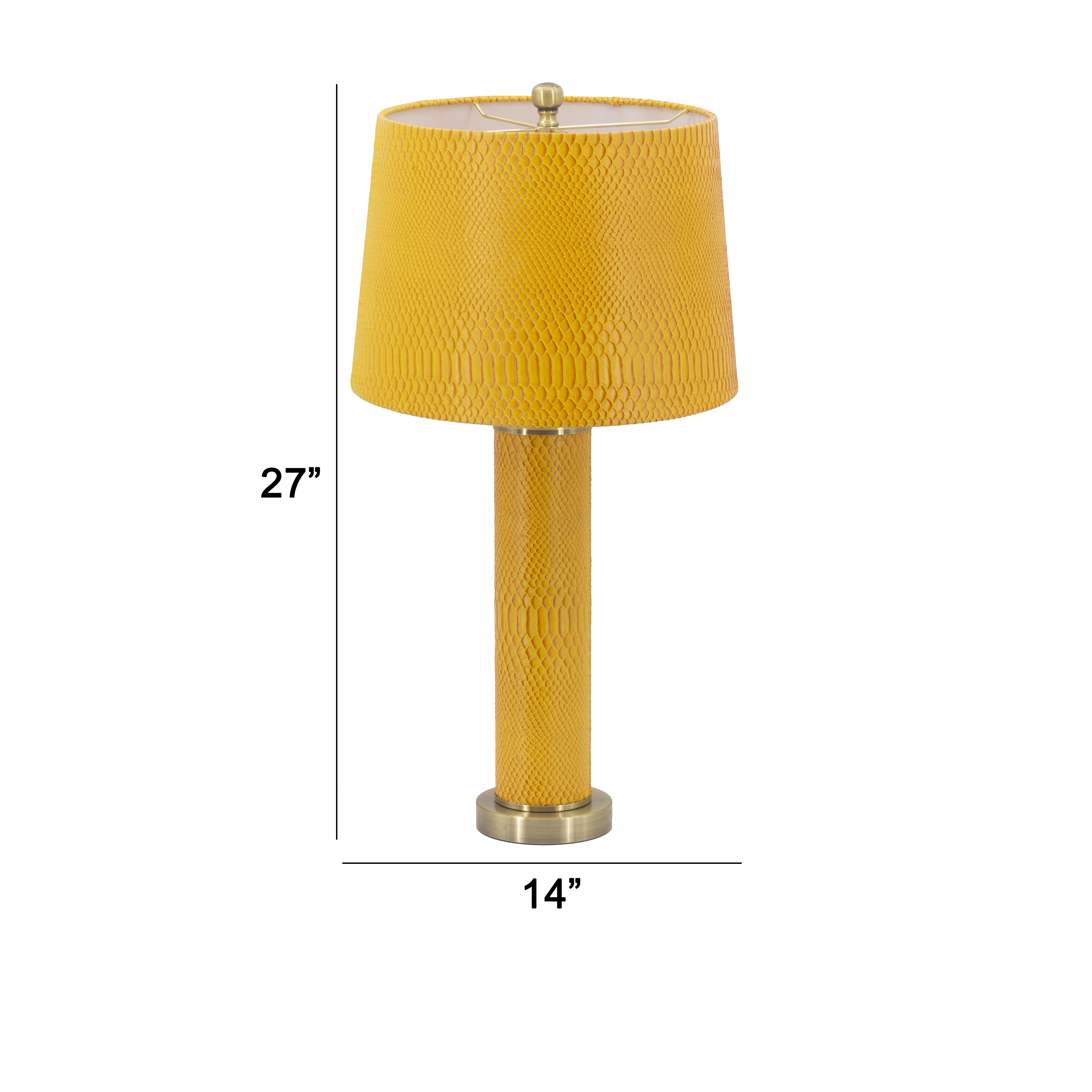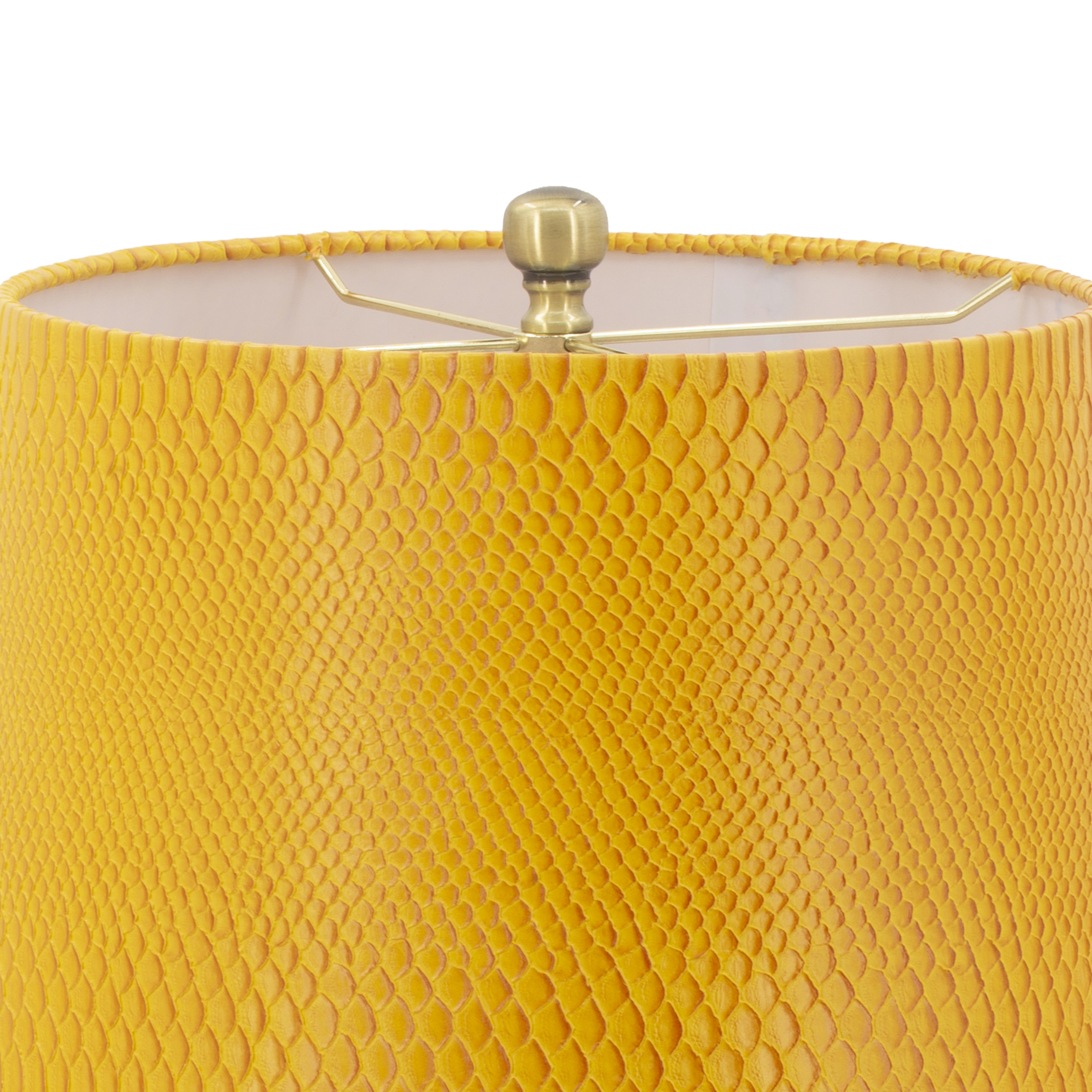 Radiating a warm and inviting flair, this modern style table lamp is upholstered in brilliantly rich yellow vegan faux leather. Crafted from a lightweight yet sturdy iron frame in a silver finish, this table lamp complements a wide variety of decor styles, color schemes, and themes with its bold look. The finial accent and subtly textured upholstery add character to this expertly made piece.