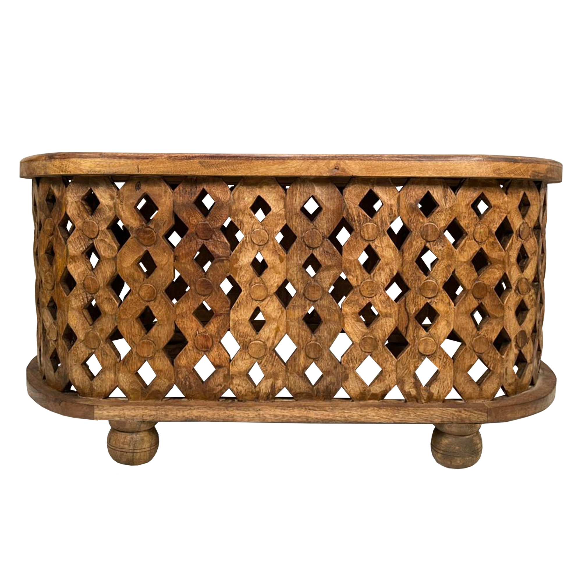 A perfect blend of style and sophistication, this coffee table will add a traditionally inspired artisanal flair to your existing decor style instantly. Featuring a wide oval top to serve snacks and beverages, the intricate diamond cut out design along the sides is accompanied with simple, textured round accents. Made from a sturdy mango wood frame, the antique brown tone complements its salvaged aesthetic. Even though it is inspired by the farmhouse style, this piece of furniture readily blends with nearly any kind of interior decor. The reinforced turned legs provide support and sturdiness and the natural finished wood edges and distressed detailing all over the frame adds character to any room. Due to the handcrafted nature of the product, there may be a slight variation in color, finish, wood grain and knots.