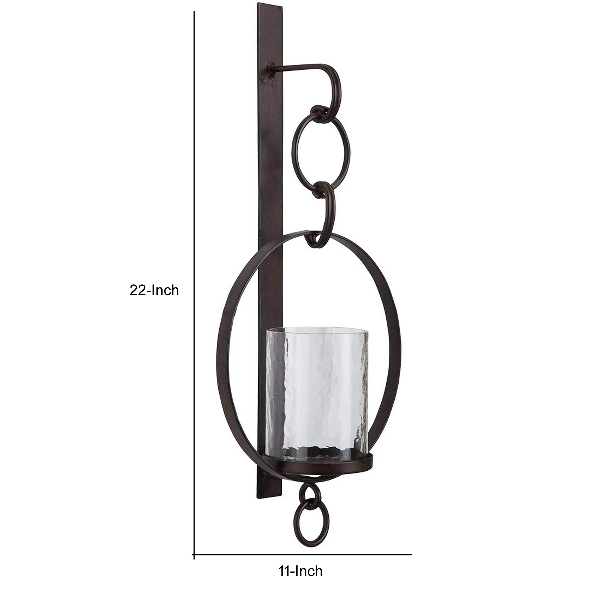 Indulge in a classy affair while creating a pleasant experience with the inclusion of this antique looking wall sconce. Showcasing round shaped metal frame, it has chain design hanger equipped with a mounting hardware to serve the hanging purpose effectively. Cylindrical shaped hurricane allows to place the favorite aromatic candle for a delightful experience.