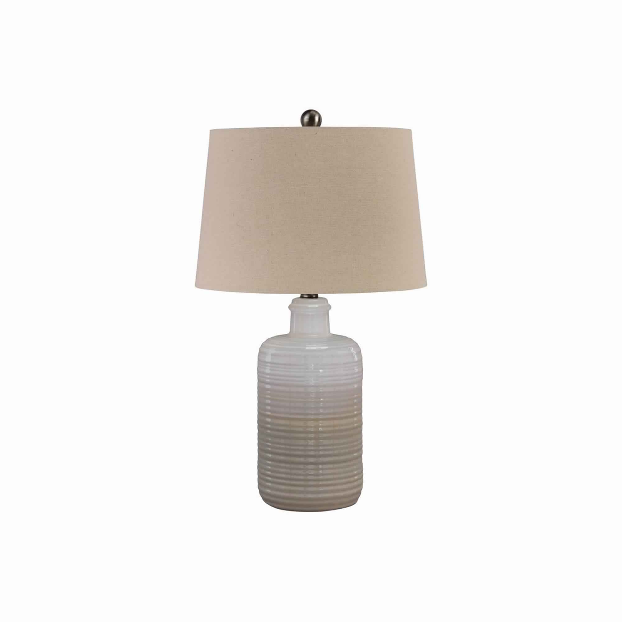 Let the lights of hope and happiness bless your home by bringing in this table lamp, available in a set of 2. It features a cylindrical ceramic body with brushed details, incorporating a 3 way switch for control and a tapered fabric shade that uses an A type bulb of 100 watt or 23 watt CFL.