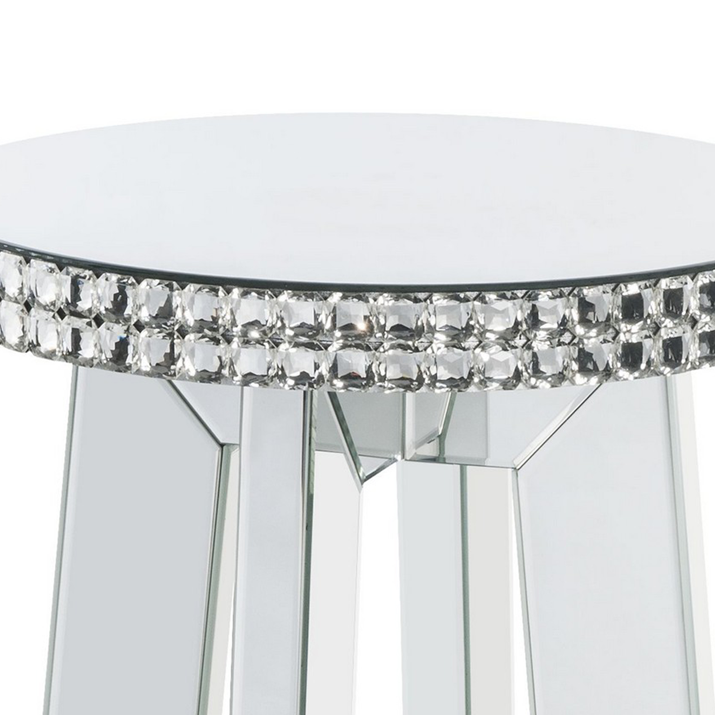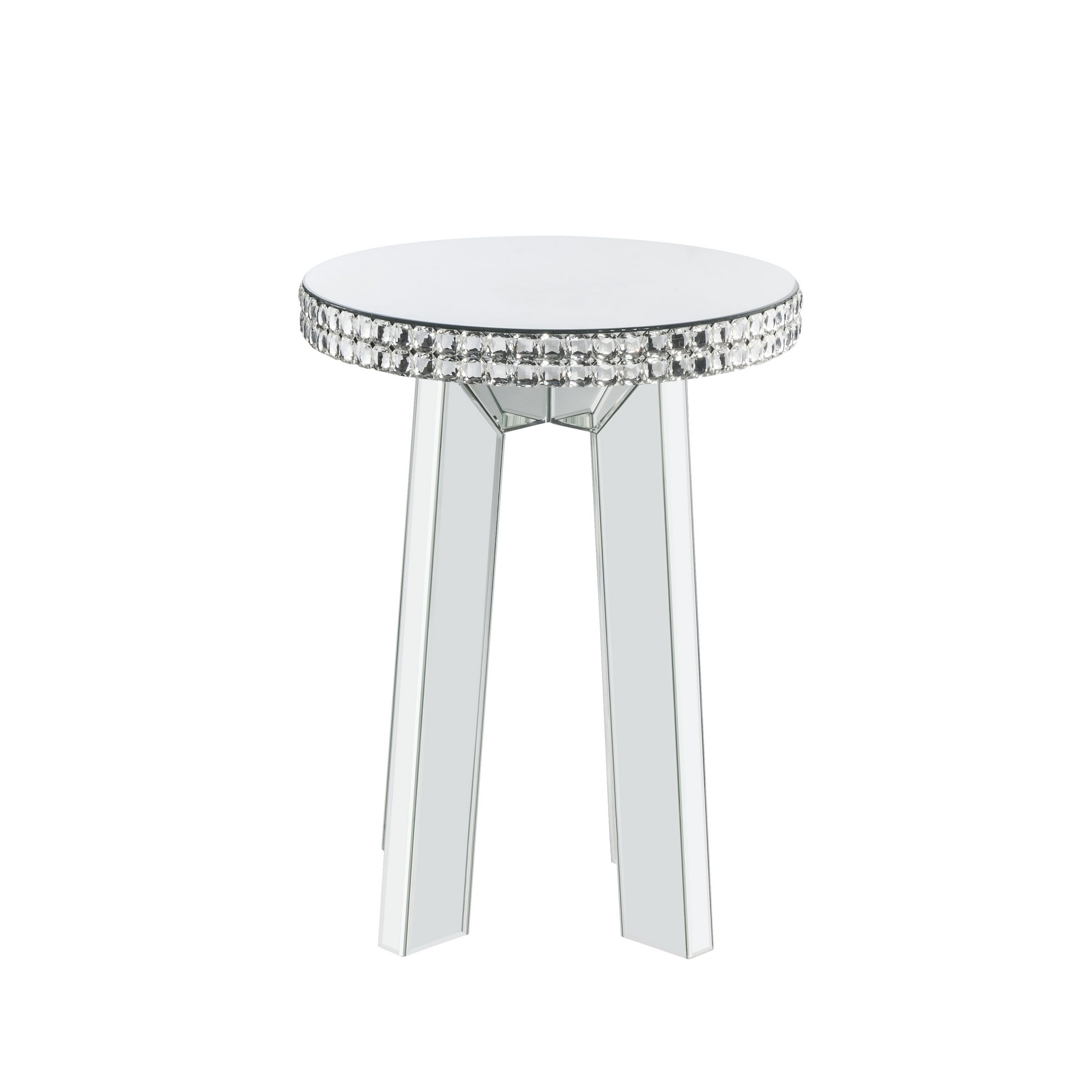 Uplift your decor to give a touch of glamour with this End Table. This piece features a round top with fully beveled mirrored panel framing and angled legs support with faux crystal accents around the apron, adding a visually stunning presence that is both elegant and bold. It will complement a wide range of modern design and is a useful addition to any living area.