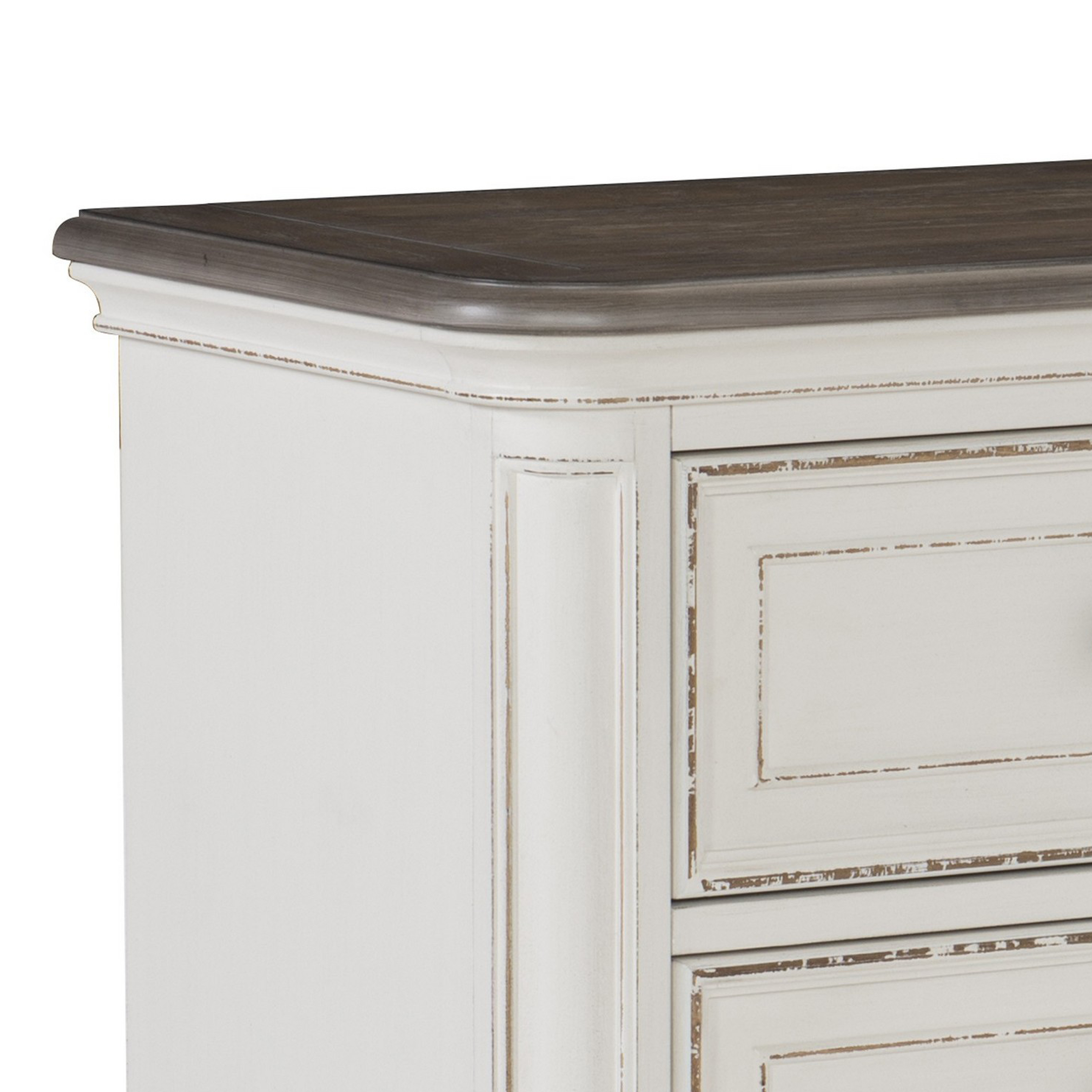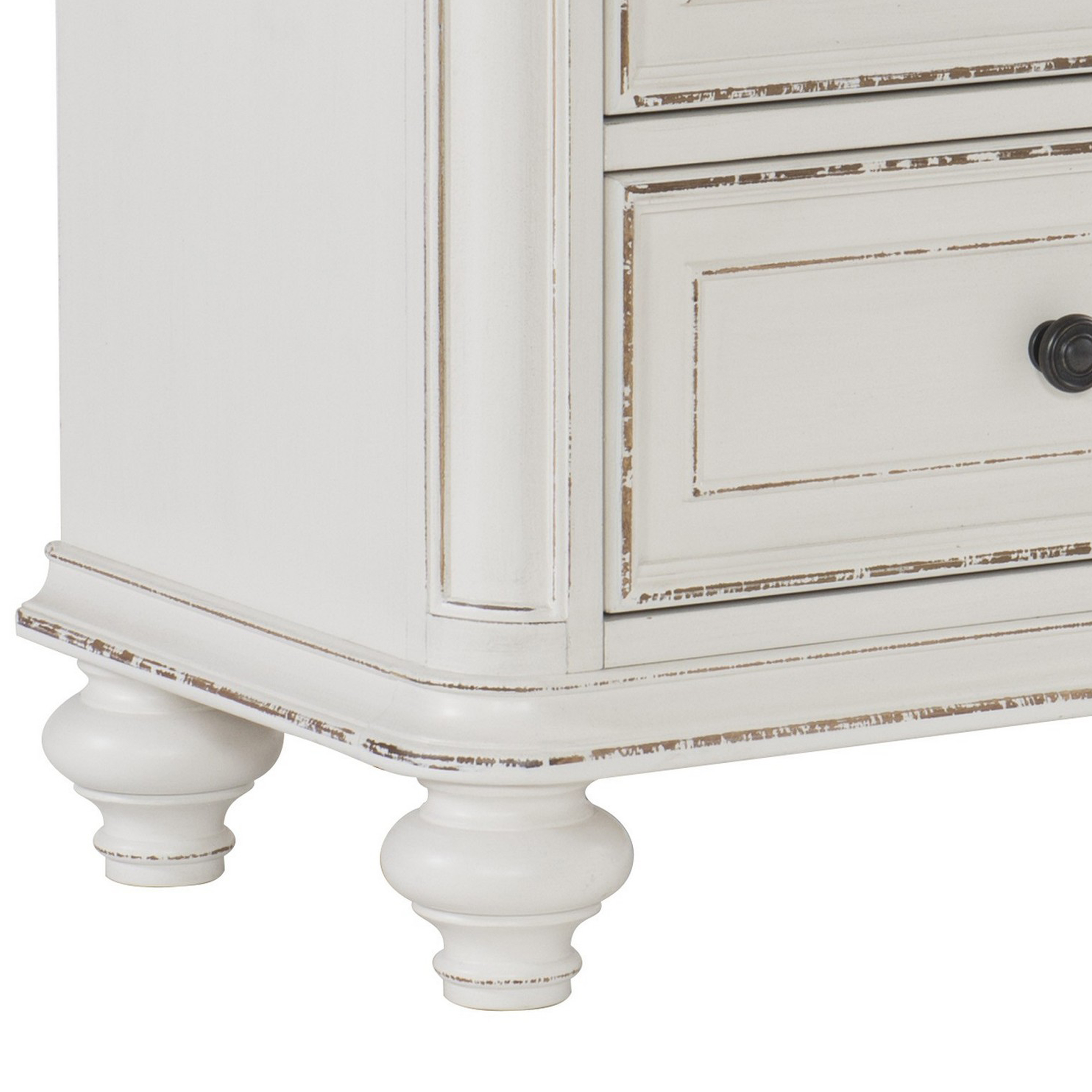 Uplift the decor of your bedroom with the inclusion of this sturdy wooden nightstand featuring transitional style. Supported on turned legs, it has 2 drawers which provides ample storage space. Round knobs facilitate easy access. Molded details with distressed finish adds to the appeal and makes it a versatile addition to your home.