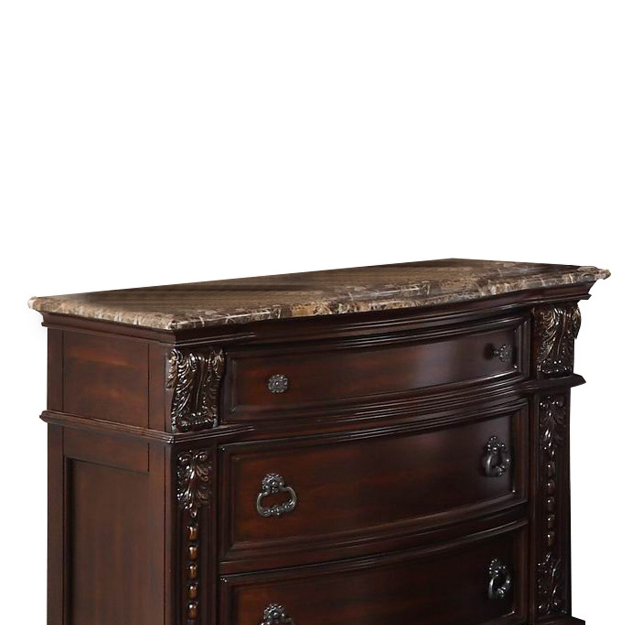 European styles are perfect for bringing the royal and classy appeal to any decor. Rejuvenate your home with this European style Wooden Nightstand in dark cherry finish, showcasing beautifully engraved leaf and nailhead trim pattern, highlighted with a marble inserted at the top.