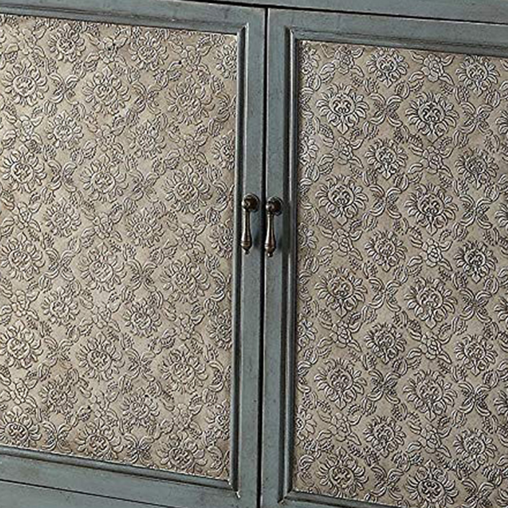 A perfect blend of style and sophistication, this Storage Cabinet is sure to add a riveting flair to the aesthetics of your interior. Incorporated with 2 smooth-gliding drawers and 2 soft closing doors, it showcases an exquisite damask inlay on the doors and drawers panel. Constructed sturdily from the combination of wood, veneer and MDF, it is accented with an antique blue tone.