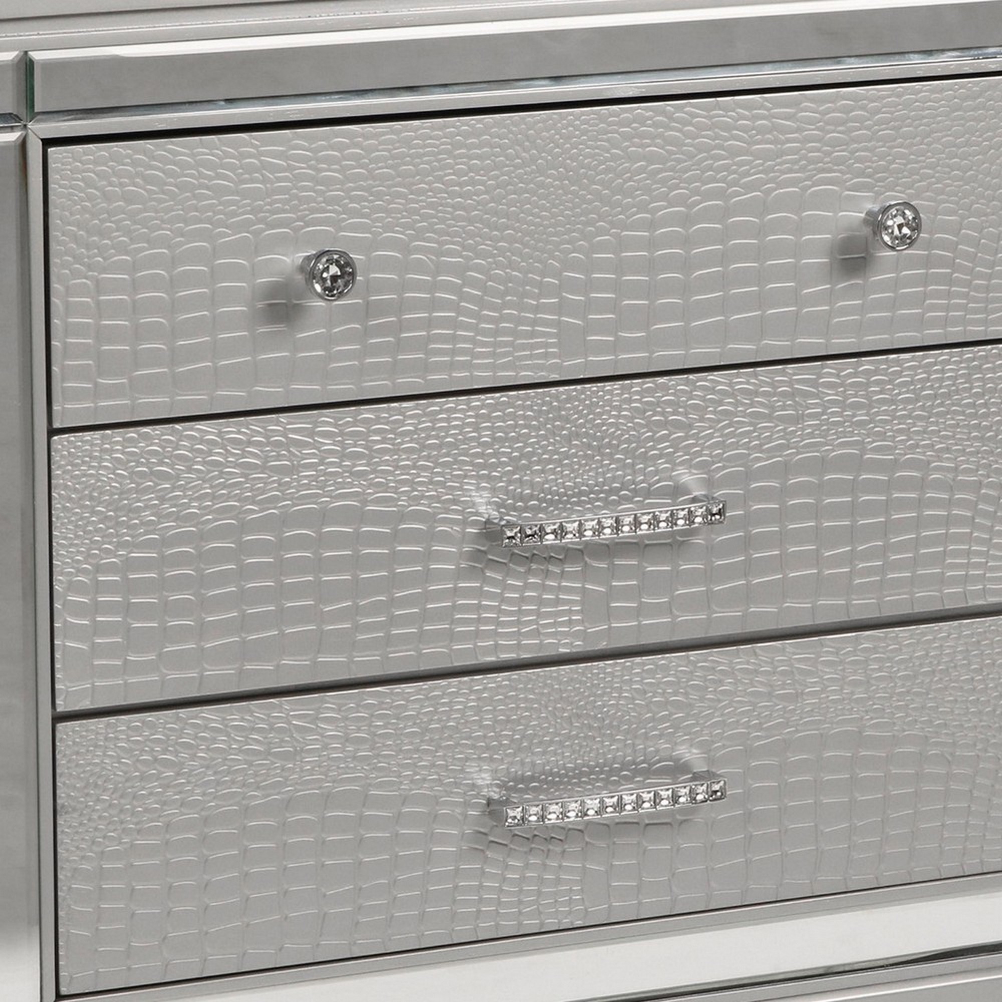 Improve the aesthetics of your home by bringing in the contemporary style nightstand. Constructed from solid wood, it features 3 drawers with metal knobs and bar handles, showcasing stylish faux crystal details. It boasts textured details on the body and mirror accents, adding to its look and is supported by turned legs.