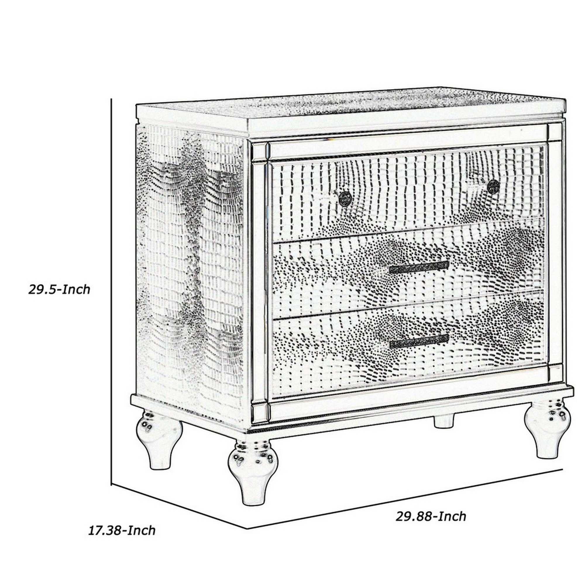 Improve the aesthetics of your home by bringing in the contemporary style nightstand. Constructed from solid wood, it features 3 drawers with metal knobs and bar handles, showcasing stylish faux crystal details. It boasts textured details on the body and mirror accents, adding to its look and is supported by turned legs.