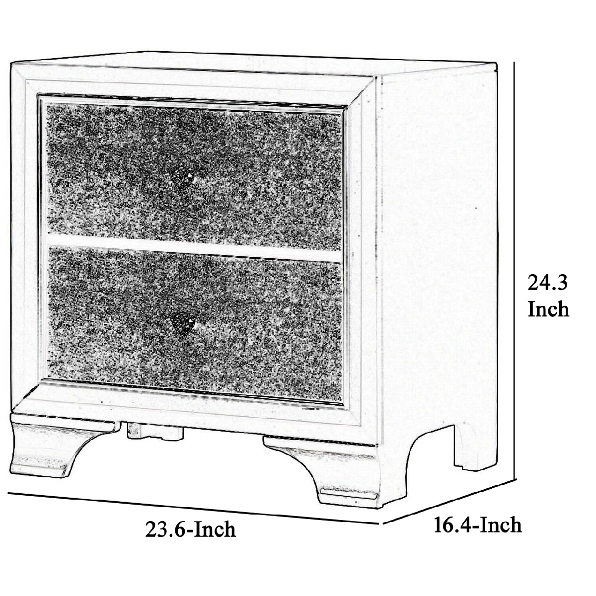 Add a contemporary touch to your bedroom with the inclusion of this sophisticated Nightstand. Constructed from solid wood, it features 2 drawers showcasing textured fronts and crystal knob pulls for access. It is supported by bracket legs, providing stability and durability.