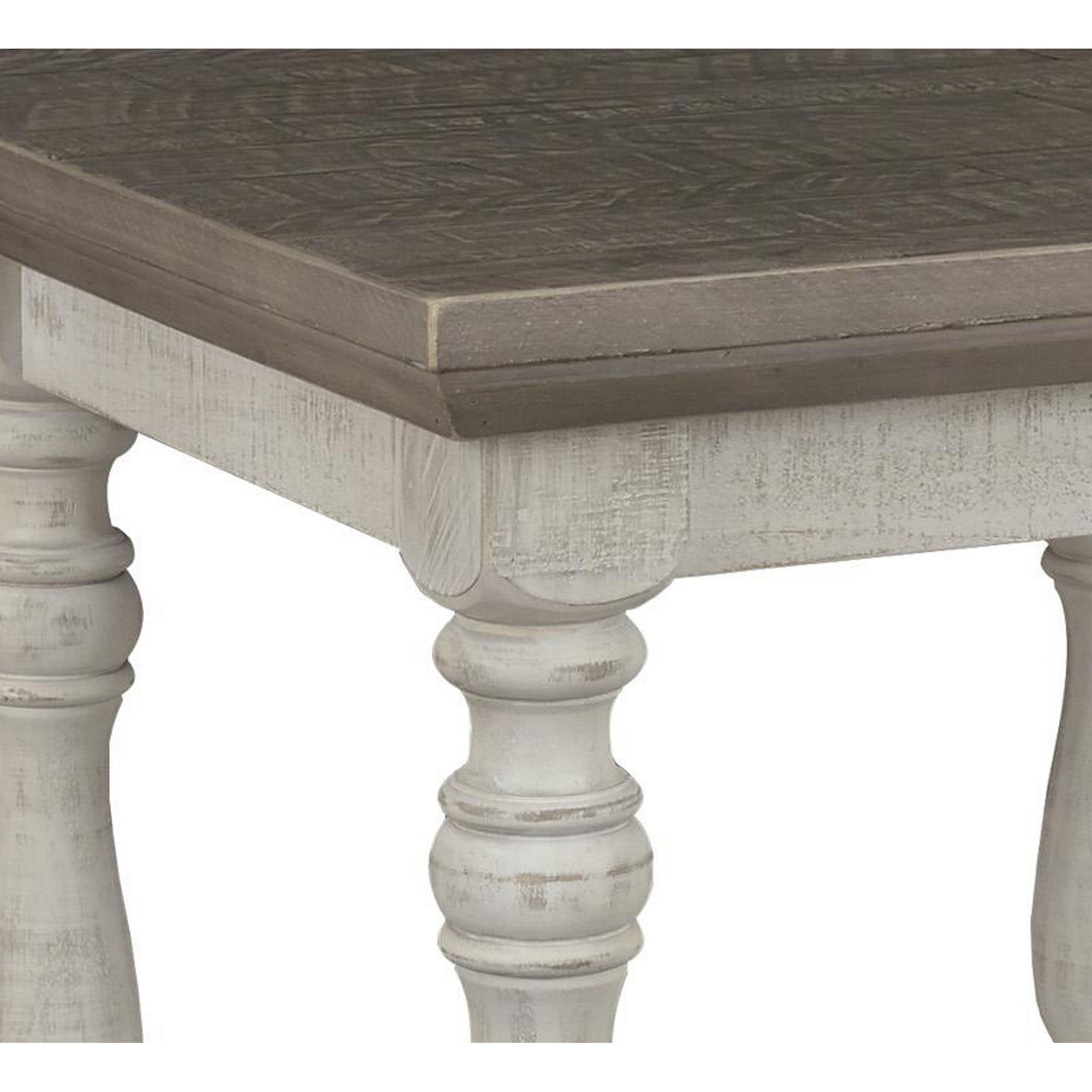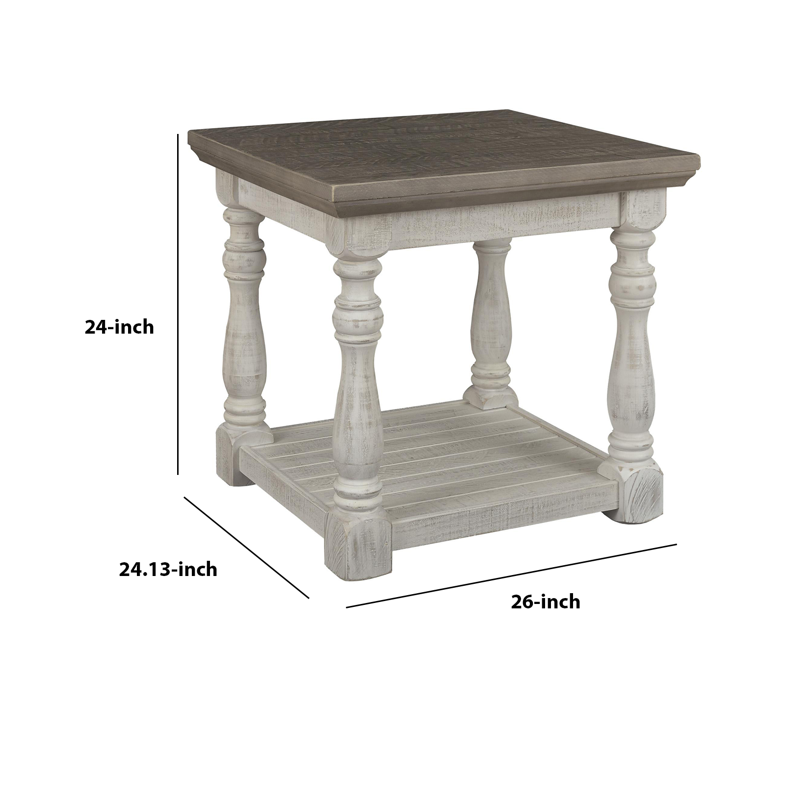 Add a farmhouse touch to your living space with the inclusion of this dual tone End Table. Constructed from a combination of veneer, solid wood and engineered wood, it features a plank style tabletop and an open bottom shelf, connected by 4 turned legs.