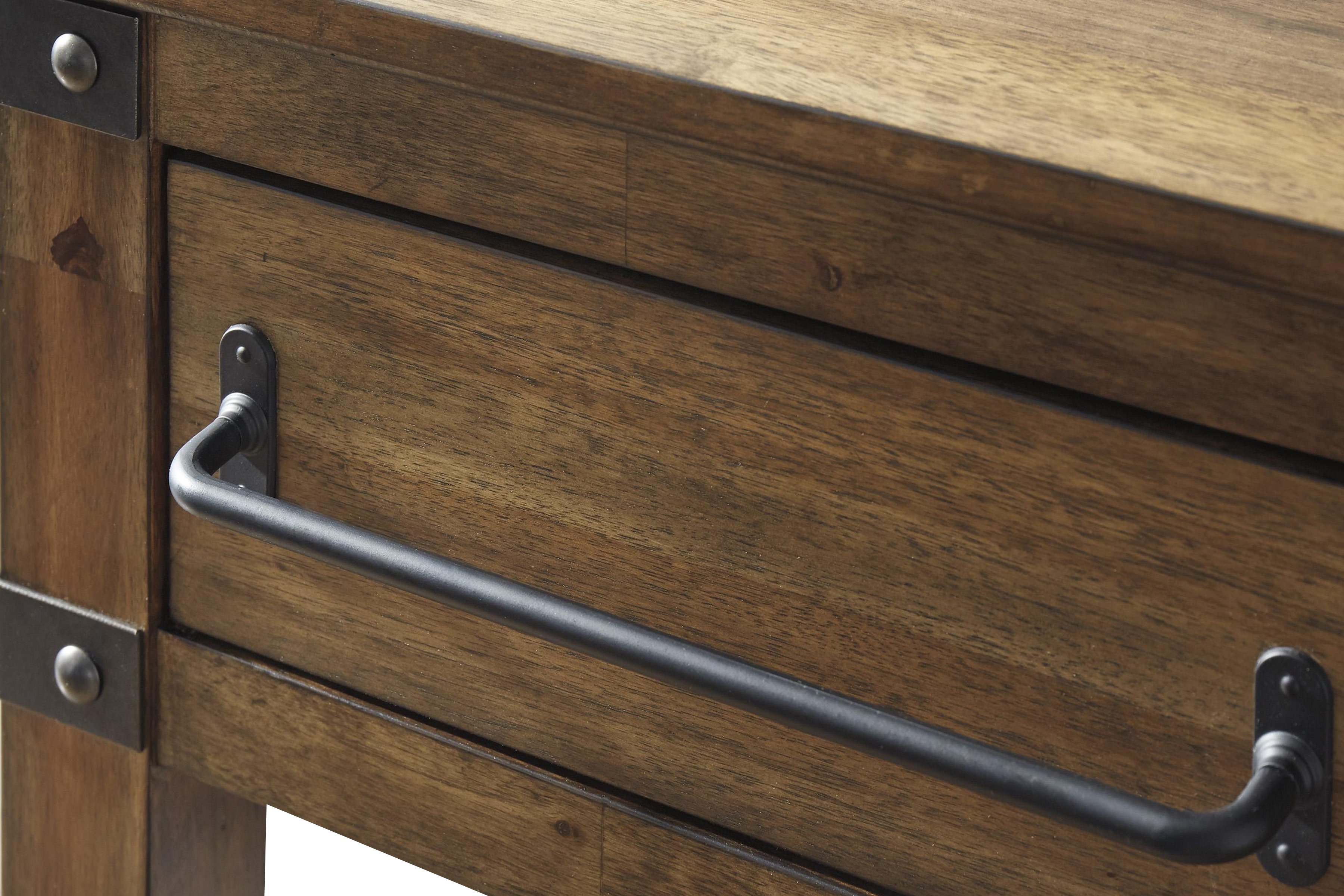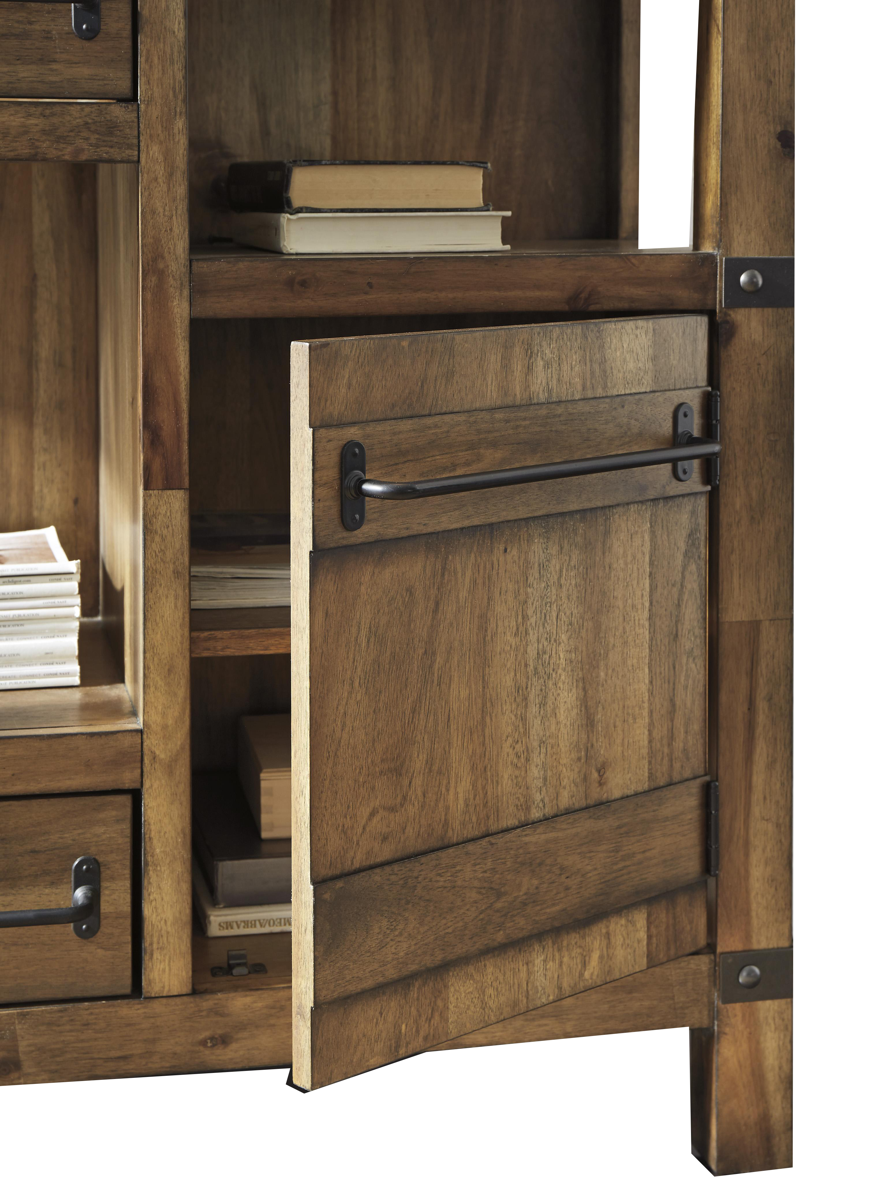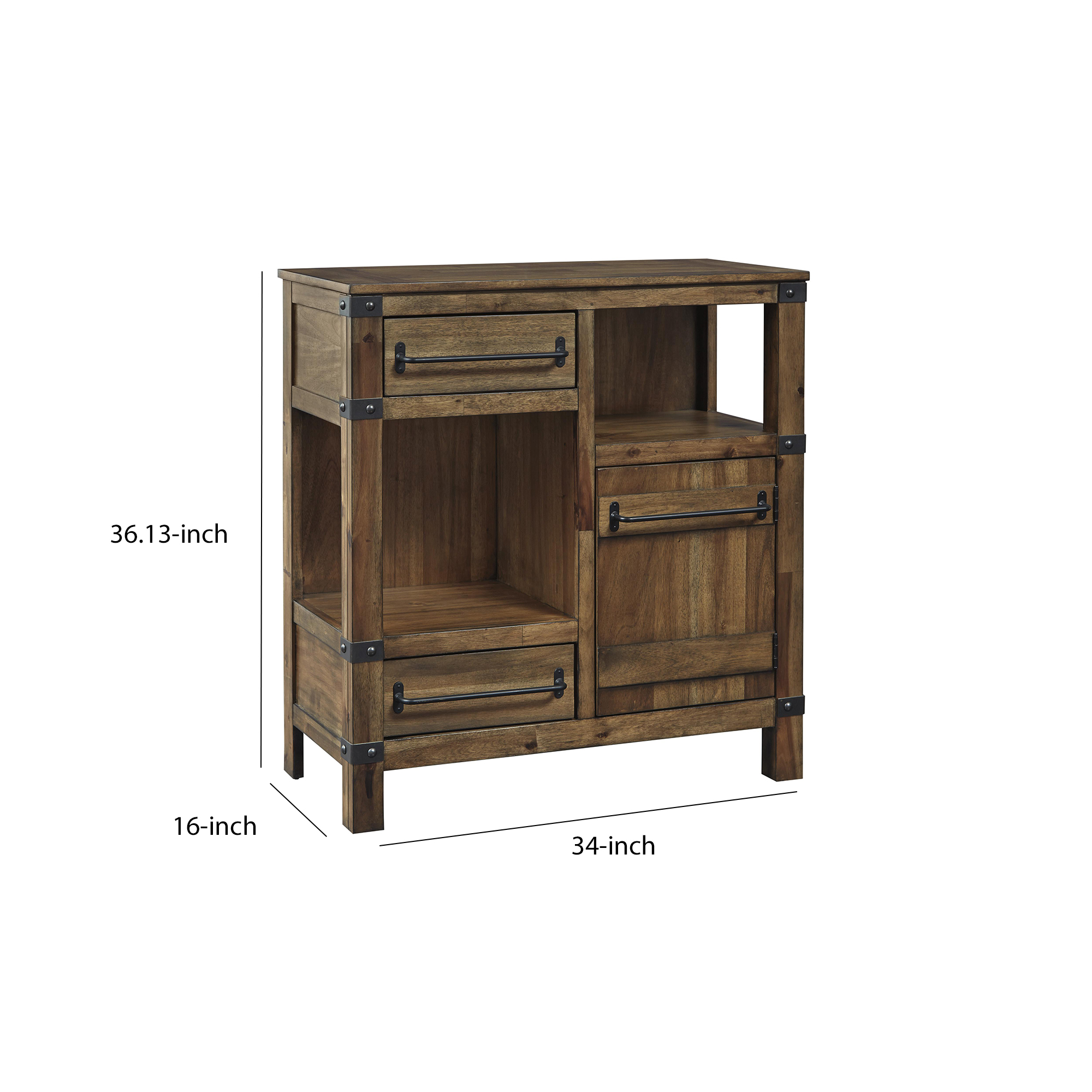 Add storage and display space to your home decor with the inclusion of this industrial style Accent Cabinet. Featuring a sturdy construction of veneer, solid wood, and engineered wood, it incorporates two drawers with metal handles, two open compartments, and a single door cabinet with a shelf inside.