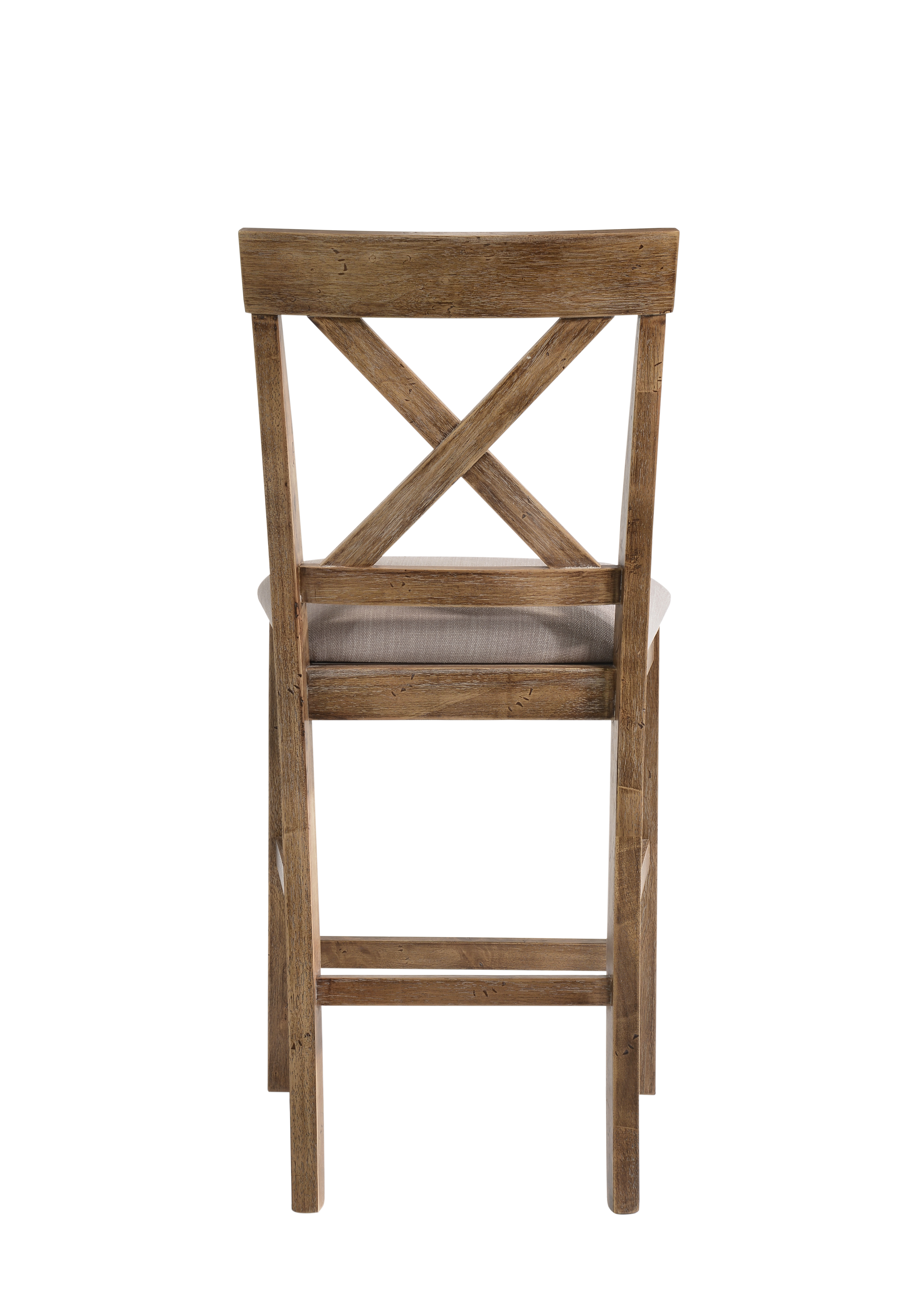 Bring a transitional touch to your eat in kitchen or dining room ensemble with this set of two understated and classic counter height Chairs. Founded atop four legs bolstered by stretchers, the frame of these chairs is constructed from wood in weathered oak brown finish making it an attractive piece of furniture. The X style back lends an eye catching appeal to these chairs, while their fabric upholstered padded seat provides ultimate comfort.