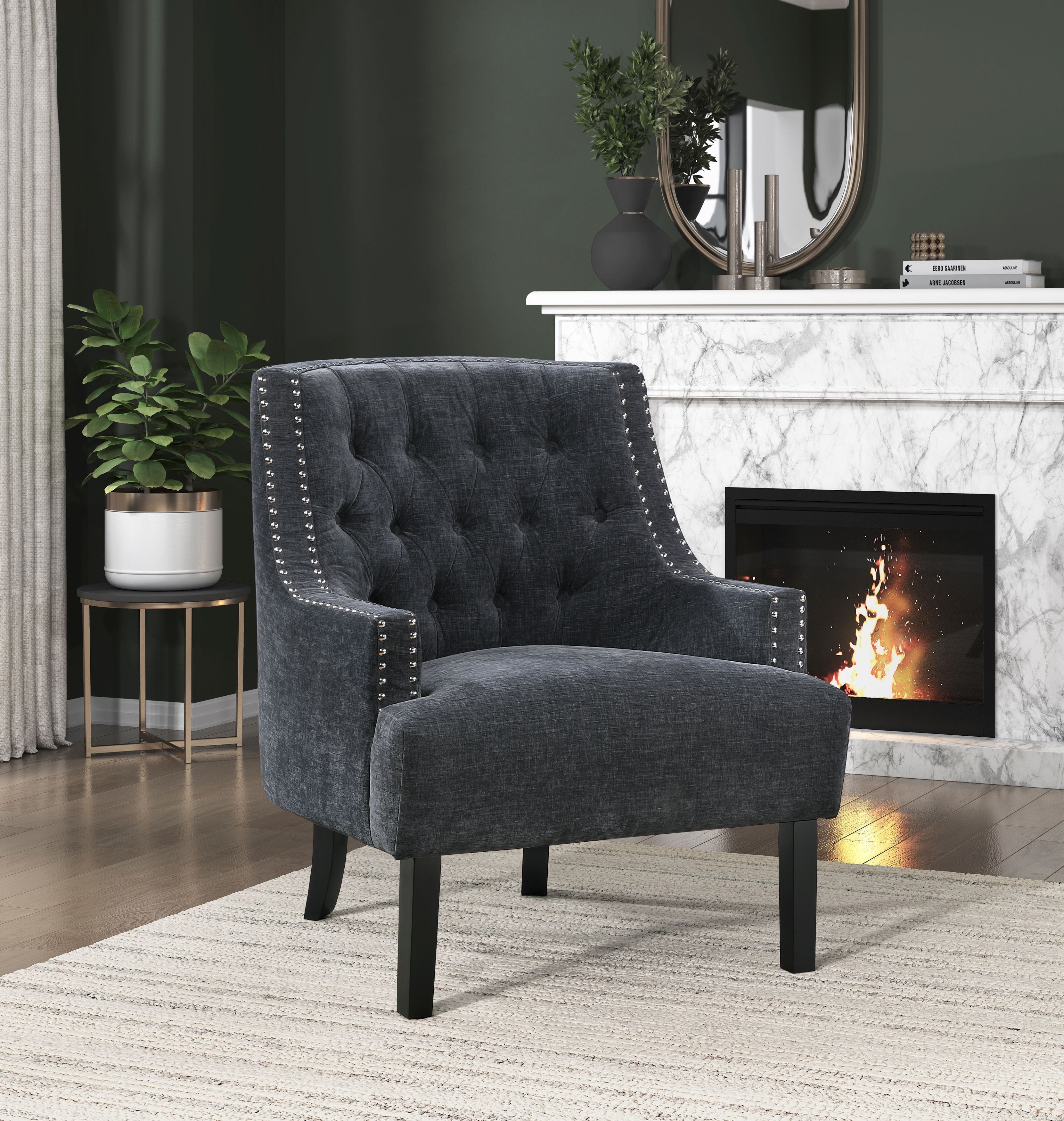 High polish nailhead accents and defines the profile of the Charisma Collection. This modern-traditional black fabric-covered accent chair provides a stylish, yet functional addition to your home.PRODUCT DIMENSIONS: Overall Dimension: 28" x 30" x 34"HSeat Width: 22.5"Seat Depth: 22.5"Seat Height: 18"Arm height: 21.5"Listing Includes: One Accent Chair Only.Simple Assembly Require.