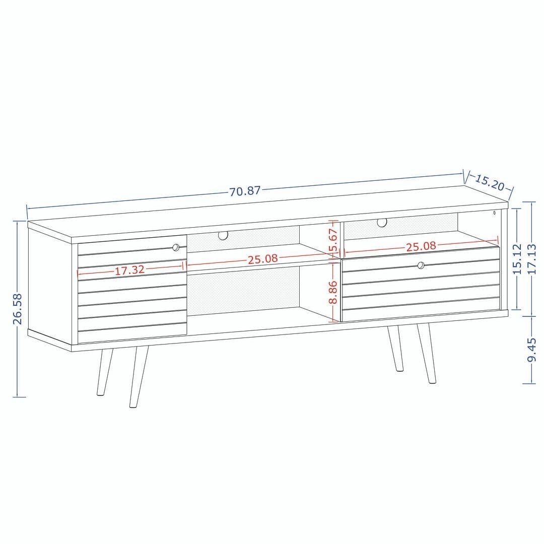 The Liberty 70.86 Mid-Century Modern TV Stand is mid-century modern at its best. Quality craftsmanship and careful detailing create the ultimate blend of style; functionality; and brilliant design. A sophisticated entertainment center; the piece features open shelving; as well as two hidden compartments perfect for stashing DVDs; board games; electronics; and media accessories. Free standing and easily moved; this stand will mix well with any decor and its artful grooves will create a statement in any space. Available in white; white and rustic brown; white and aqua blue; white and yellow; rustic brown; rustic brown and white; and rustic brown and yellow.