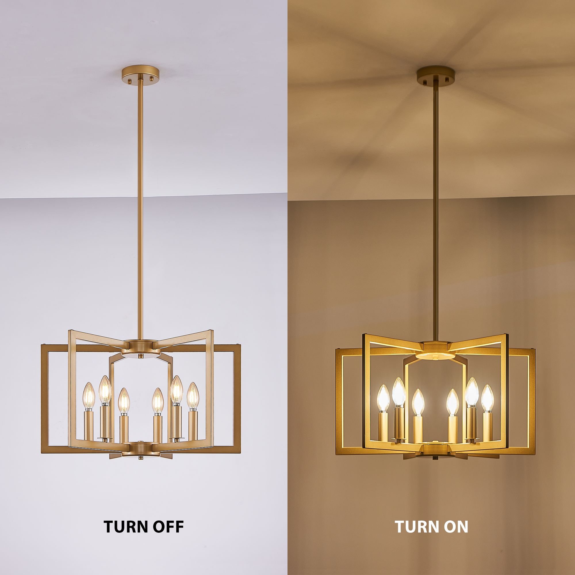 21" Modern Golden Geometric 6-Light Chandelier – Industrial Metal Pendant Light FixtureMaterial: IronColor: GoldenBulb Type & Quantity: 6*E12 Bulbs (Bulb Not Included)Applicable Space: Living Room, Dining Room, or KitchenInstallation Mode: Ceiling MountedPower Supply Mode: Hard-WiredWattage: Maximum 60W per BulbVoltage: 110V