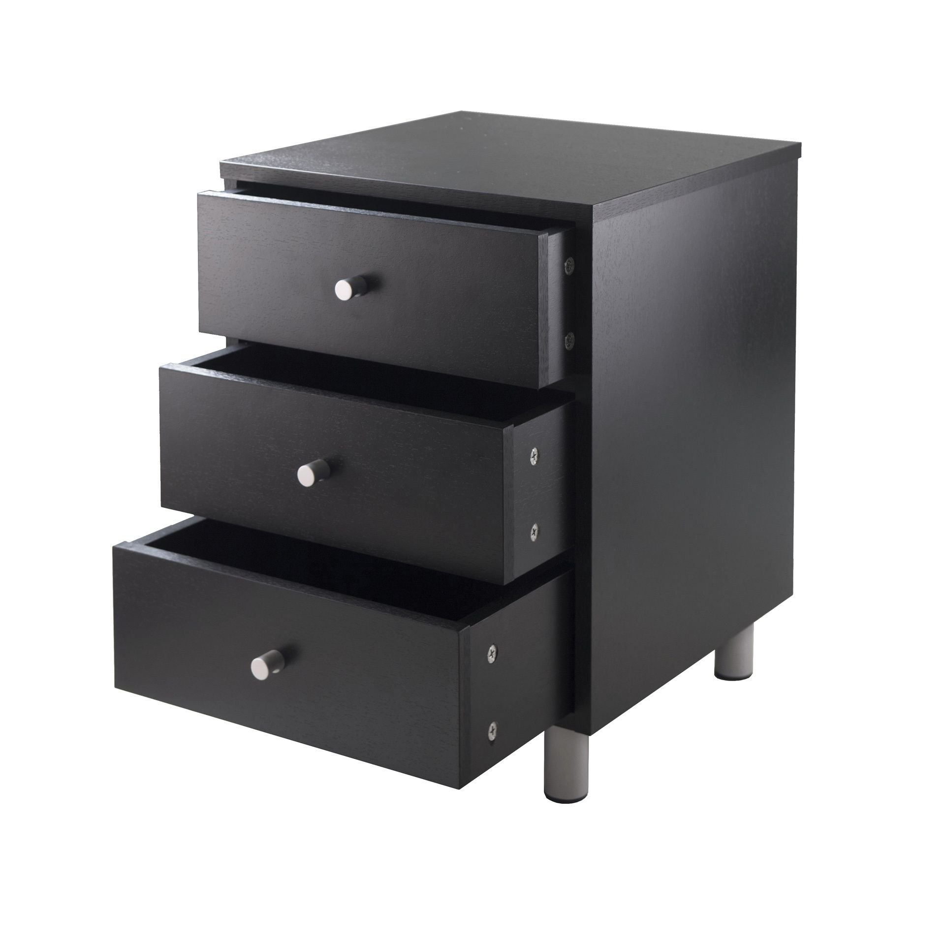 Perfect table for your night time essentials with three drawers and is also a stylish addition for your bedroom. Black with metal accent. Overall table size 15.75"W x 16.1"D x 22"H. Top dimension is 15.75"W x 15.75"D and inside drawer is 12.75"W x 13.6"D x 4.3"H. Floor clearance is 4". Black veneer on composite wood. Assembly required.Overall table size 15.75"W x 16.1"D x 22"H. Table top is 15.75"W x 15.75"D.Table comes with 3 Drawers with inside storage dimension of 12.75"W x 13.6"D x 4.3"H.Door clearance is 4". Black veneer on composite wood. Assembly required.nullnullnull