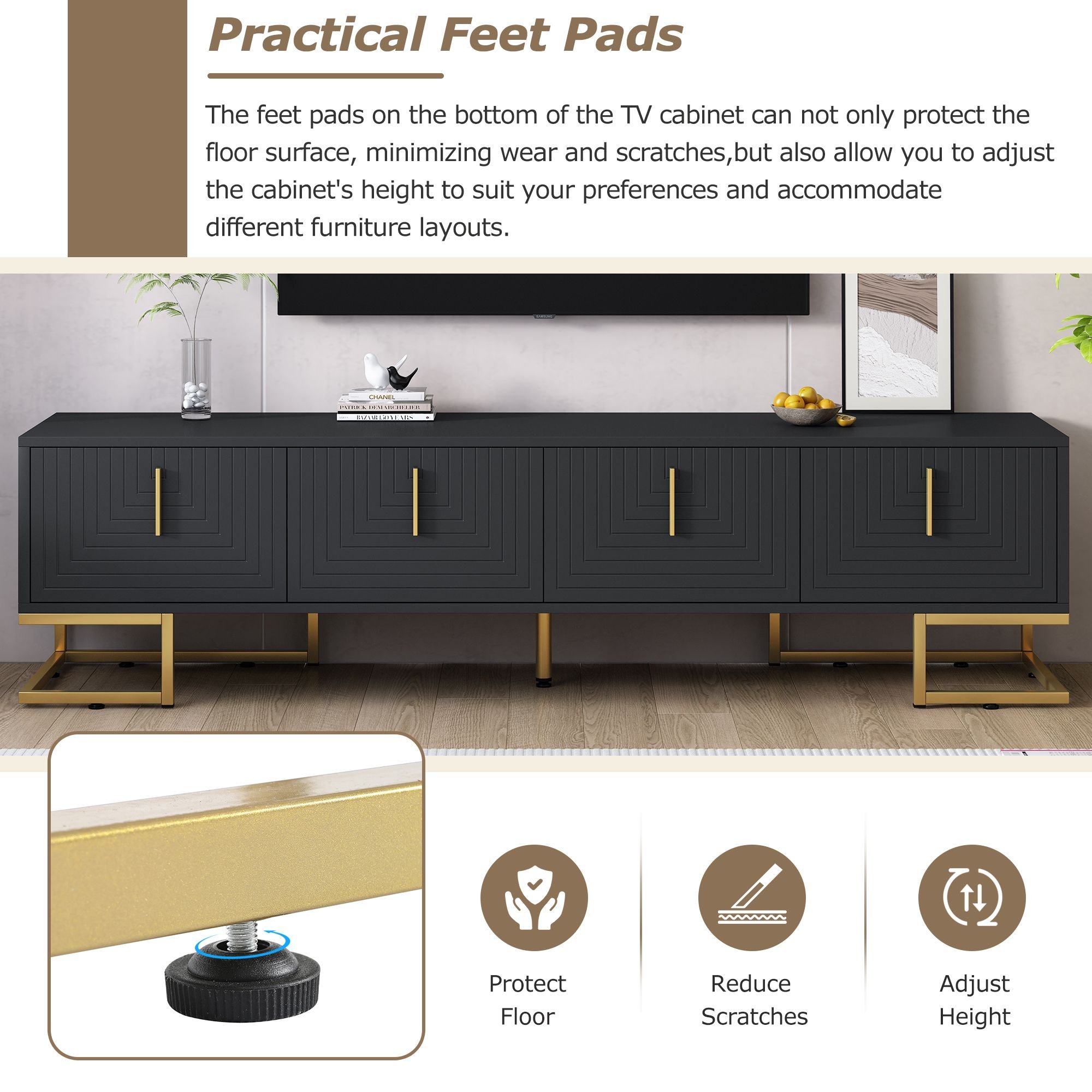 Practical Feet PadsThe feet pads on the bottom of the TV cabinet can not only protect the floor surface, minimizing wear and scratches, but also allow you to adjust the cabinet's height to suit your preferences and accommodate different furniture layouts. Furthermore, in case of an uneven floor, these adjustable feet pads ensure the TV cabinet remains stable and steady.