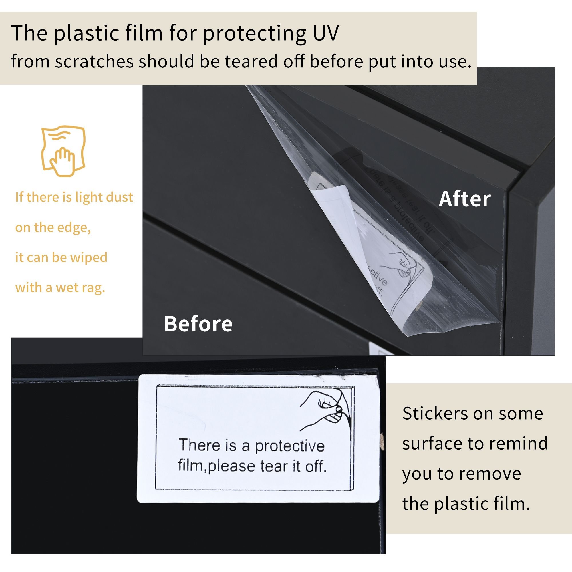 NoticeThe plastic film for protecting UV from scratches should be teared off before put into use. If there is light dust on the edge, it can be wiped with a wet rag.