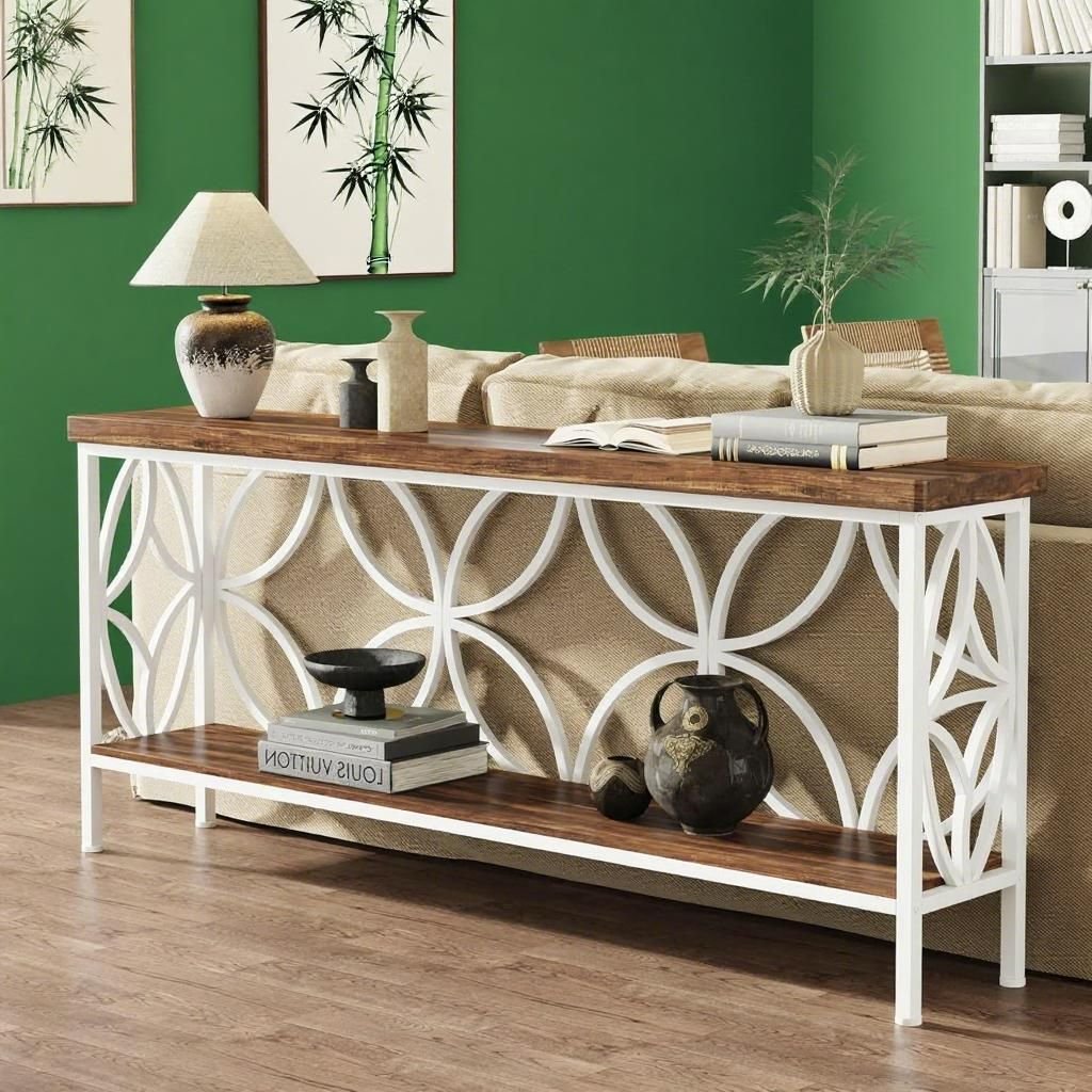 [Industrial-Style Behind Sofa Table]: Combining vintage wood grain surface with black metal accents, this long console table oozes a sense of farmhouse that has passed the baptism of time. Designed with a unique, intricately shaped metal frame on the back, this slim console table blends effortlessly contemporary style with a hint of artistic flair