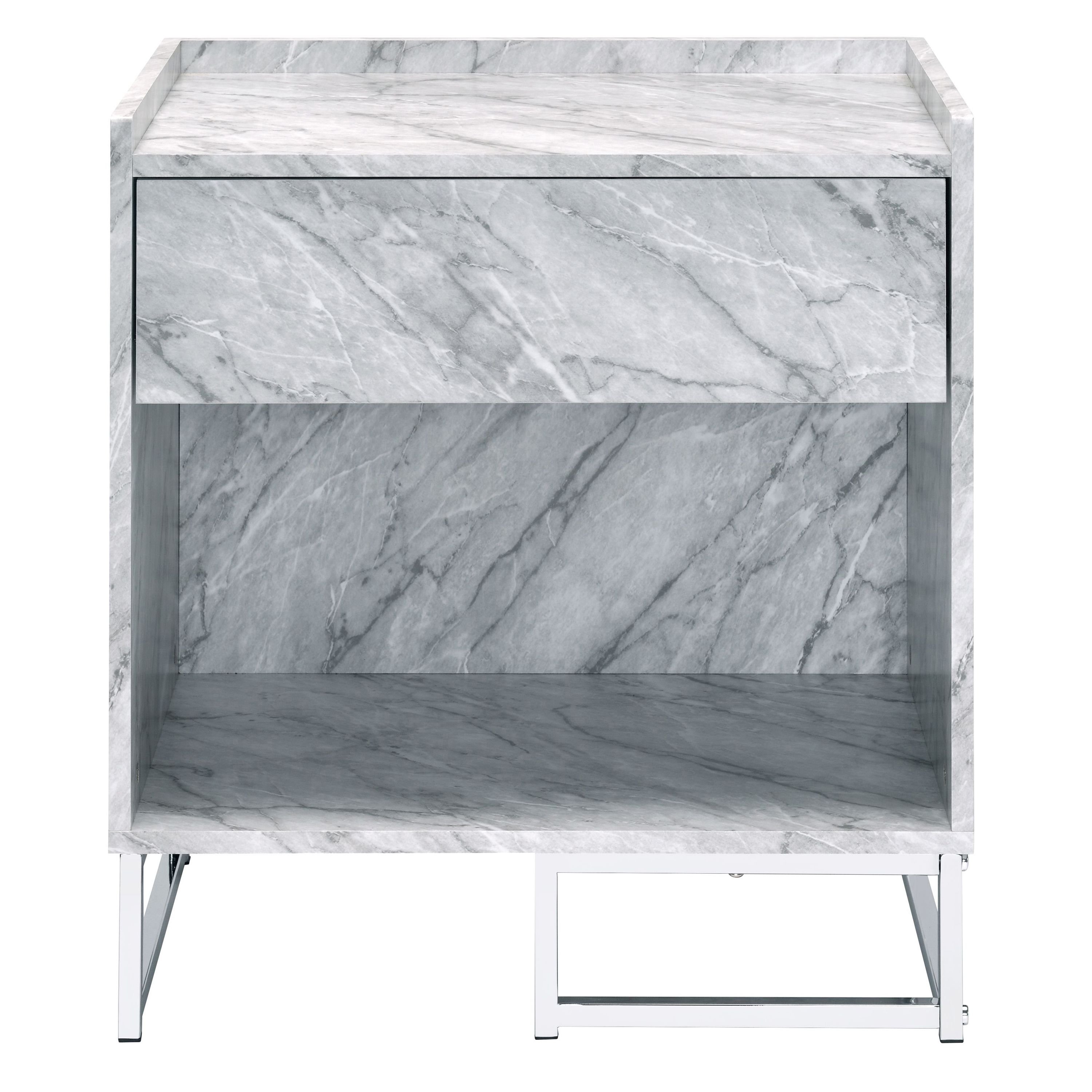 Elevate your living space with this elegant accent table, adorned with a faux marble finish for a sophisticated touch. Boasting a convenient drawer with 1/2 extension drawer glide and a bottom shelf, it offers ample storage for displaying decor or keeping living room essentials close at hand, providing both style and functionality for your home.