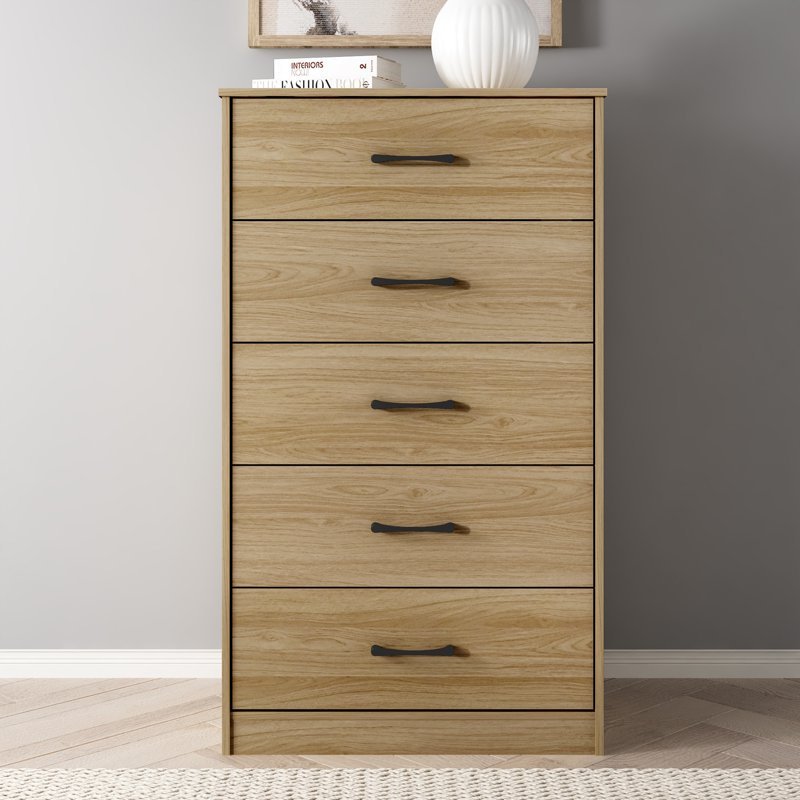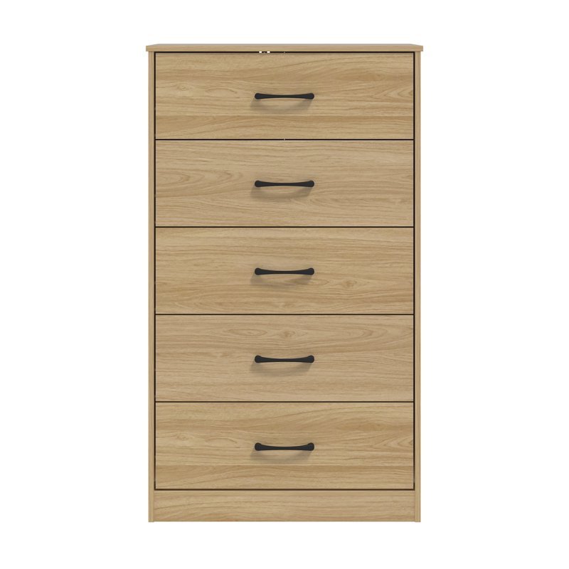 This five-drawer dresser is as simple to put together as it is sleek. Featuring a design that allows for quick and easy assembly by anyone, this piece gives you an elevated look without the hard work. Grooved Wood Compositeen panels are designed to stay in place so you can effortlessly snap them together and then move on with your day. With clean lines and a timeless silhouette, this adult dresser boasts generously sized drawer pulls, and a lamination process ensures a consistent euro oak finish throughout. Tall and lean, this dresser features five spacious drawers that slide smoothly on a metal glide system. Add understated elegance to your bedroom with this casual transitional piece. Assembly required.* Minimally adorned casual transitional adult dresser with a classic silhouette* Wood Composite, MDF, particle board and PU paper foil laminate construction in a euro oak finish* Ultra-fast, frustration-free, easy assembly* Overall Dimensions: 47.75H x 27.75W x 16.5D* Assembly required* Item will ship in one box* Effortless metal glide system* This product is compliant with the U.S. STURDY Act, which addresses anti-tip specifications that protect children. The design prohibits multiple drawers from being opened at once for safety purposes, and anti-tip hardware is included in the package* Works well with modern and contemporary décor* Contrasting matte black drawer pulls